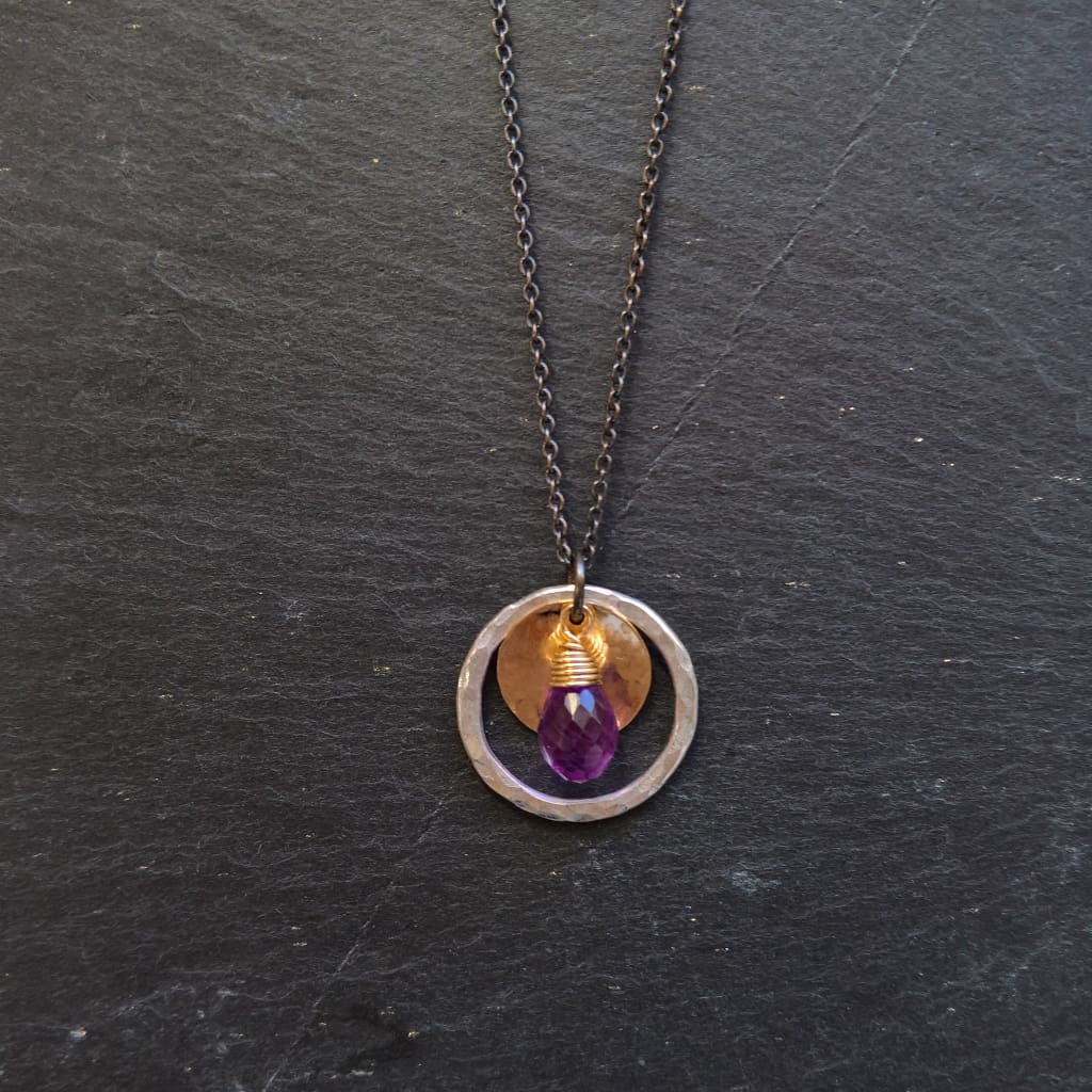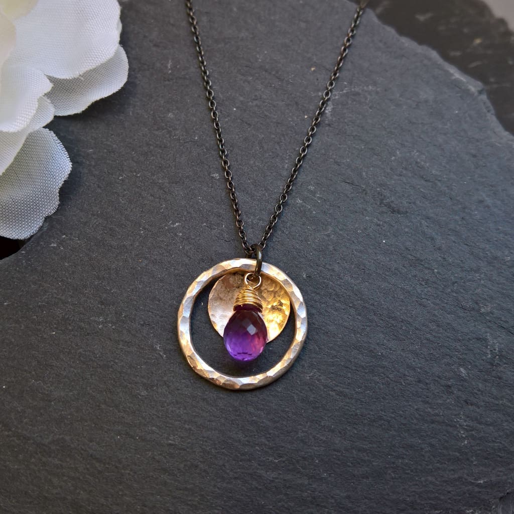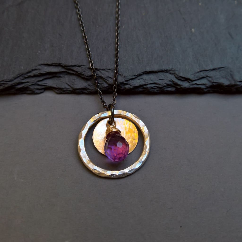 Amethyst circle pendant necklace - Amethyst teardrop, fused fine silver & gold filled circles hang together on a oxidised silver chain. Make a statement with this simple but bold pendant necklace. Both circles have been hammered to add a subtle sparkle to the metal contrasting with the matte finish of the oxidised sterling silver chain while the amethyst make a stunning contrast against the mixed metal.