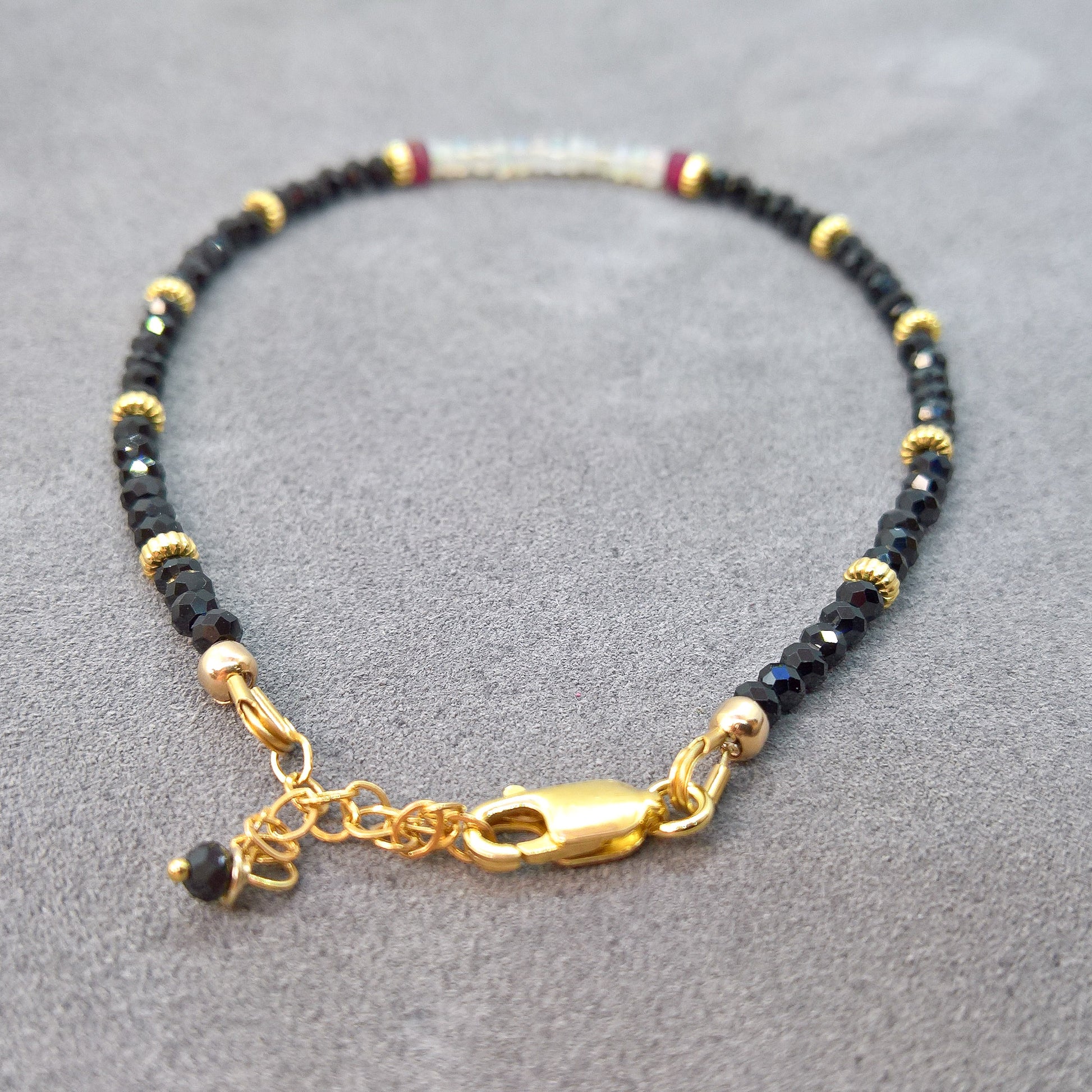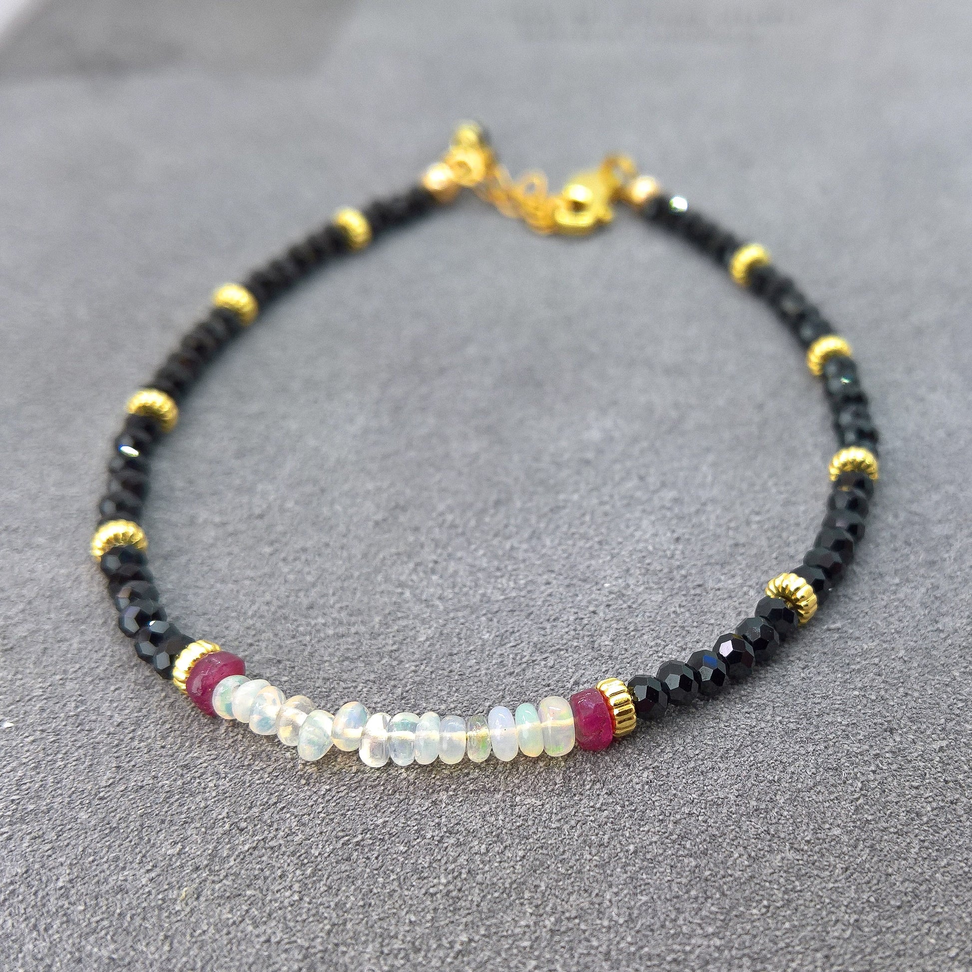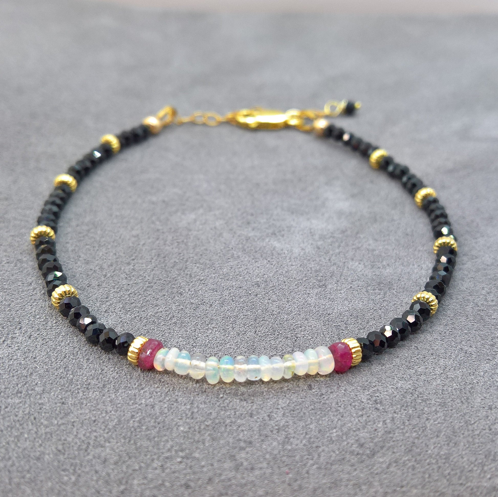 Black Spinel and Opal bracelet - This dainty skinny bracelet features crisp black spinel and iridescent opals with striking red ruby accents in gold vermeil silver. This dainty bracelet will look elegant on its own or with other stacking bracelets.