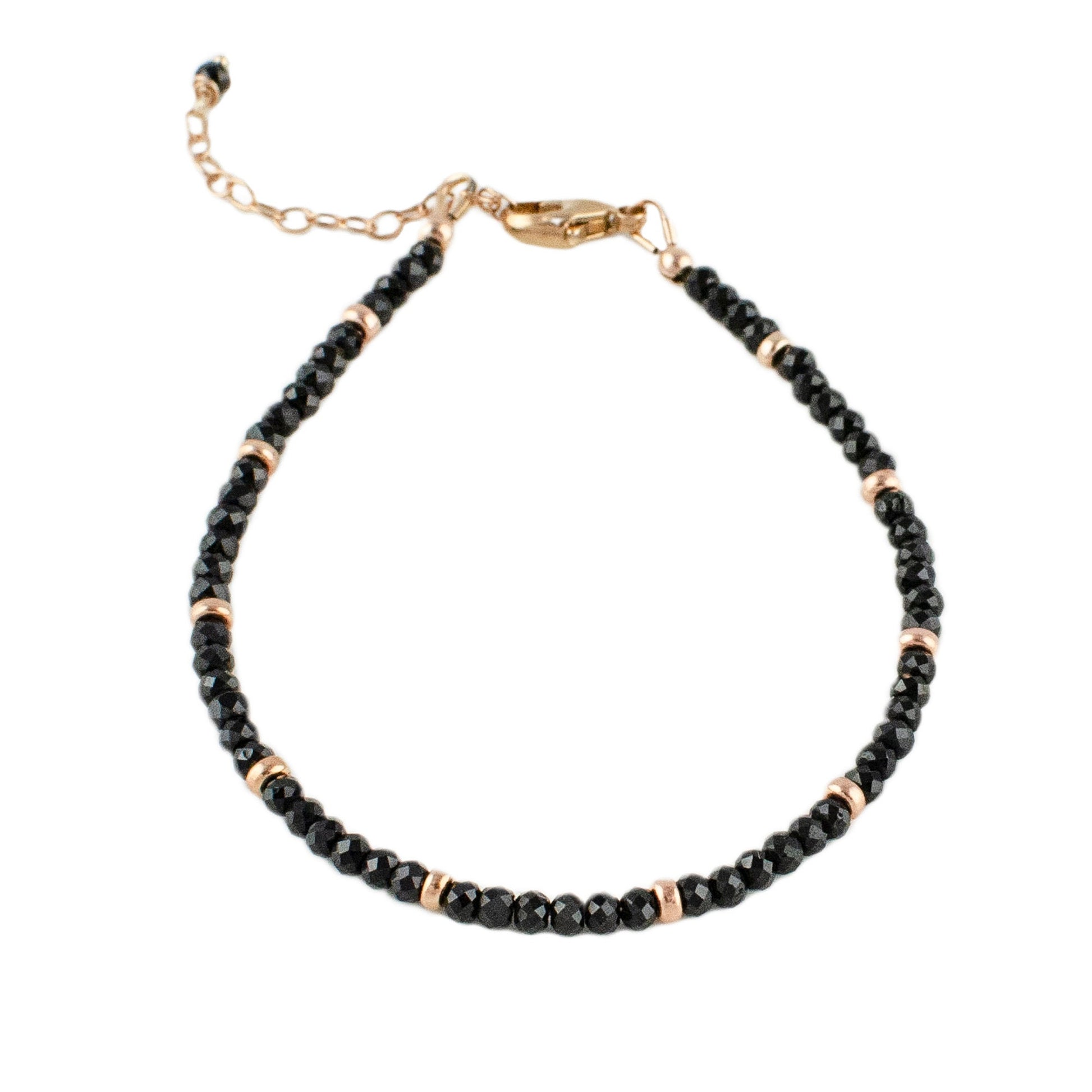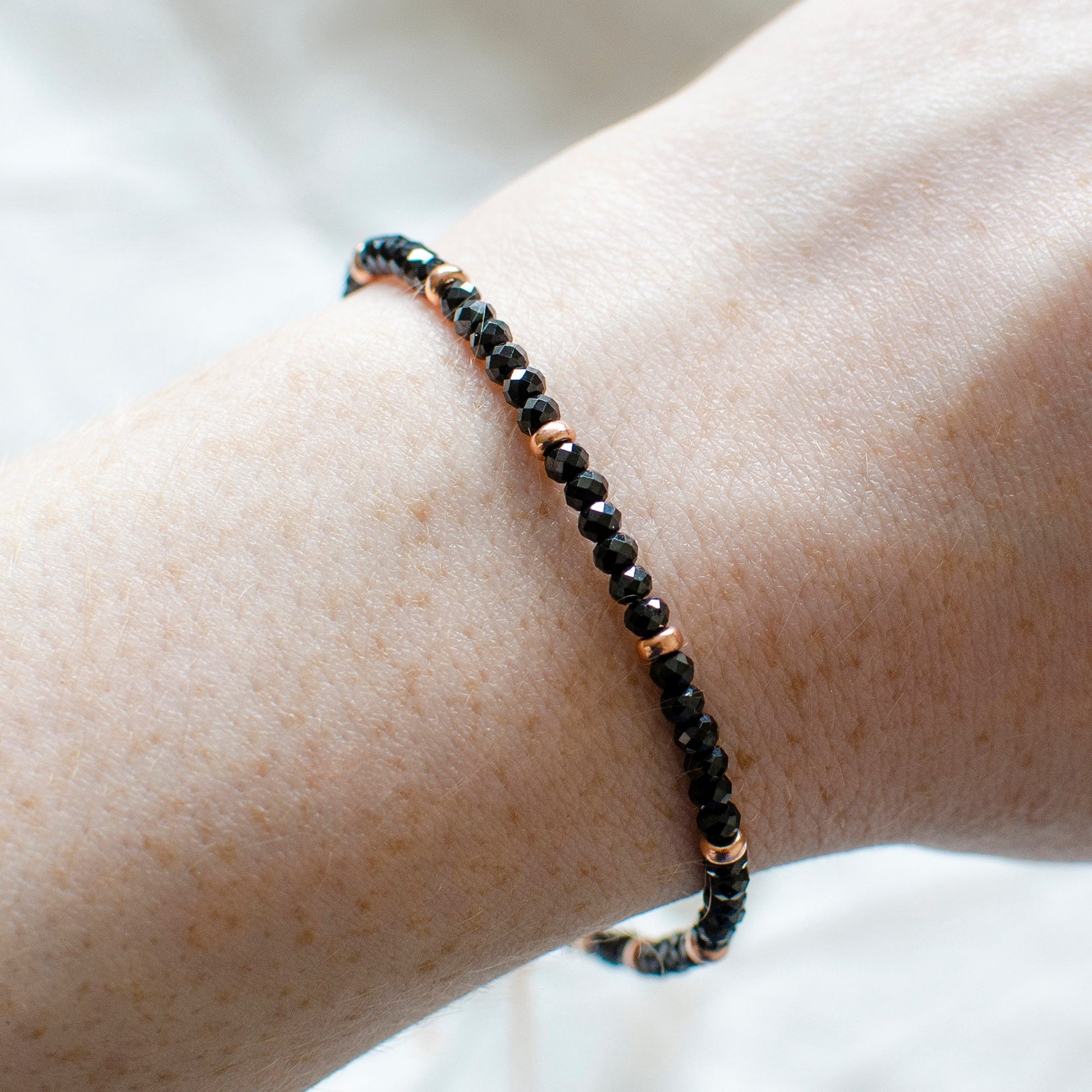 Black Spinel Rose Gold Adjustable Beaded Bracelet - This dainty Unisex Black Gemstone Skinny Stacking Bracelet features high-quality black spinel gemstones, rose gold vermeil silver accent beads and rose gold filled chain.