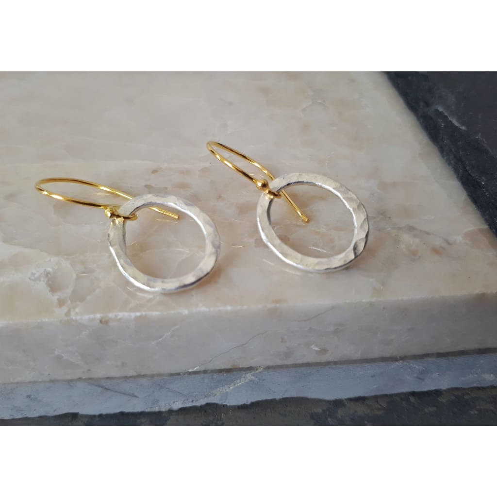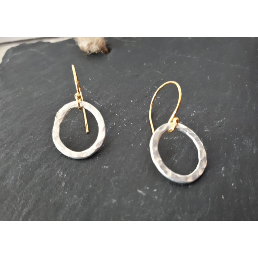 Gold and Silver Earrings - Hammered fused silver ovals dangle off gold vermeil siler shepherd's hook earrings. Add a little boho chic to your wardrobe with these simple but funky dangly hoops. The delicate earrings are light and easy to wear - great for every day! Made from fused fine silver, the hoops have been hammered to sparkle as they swing in your ears.