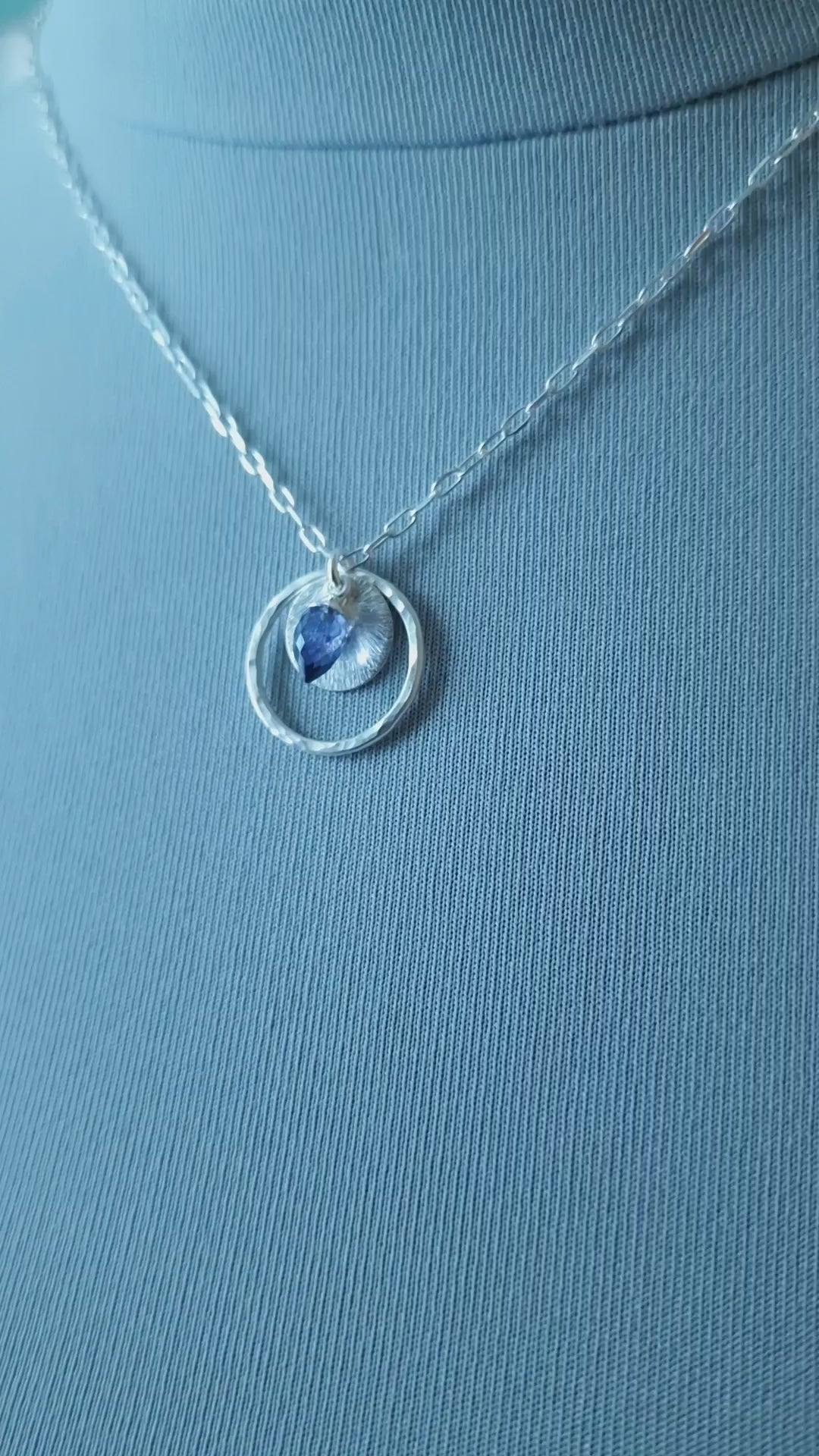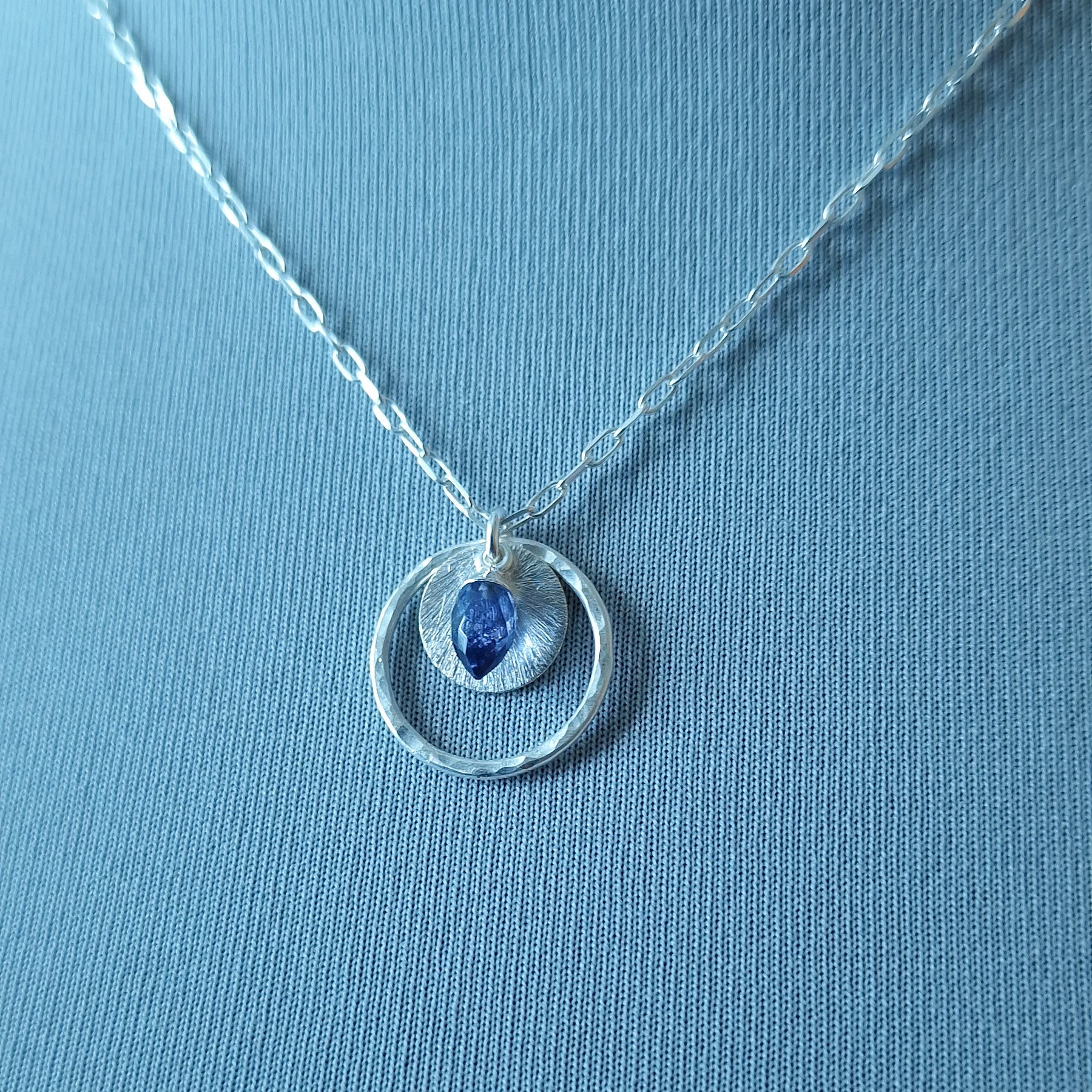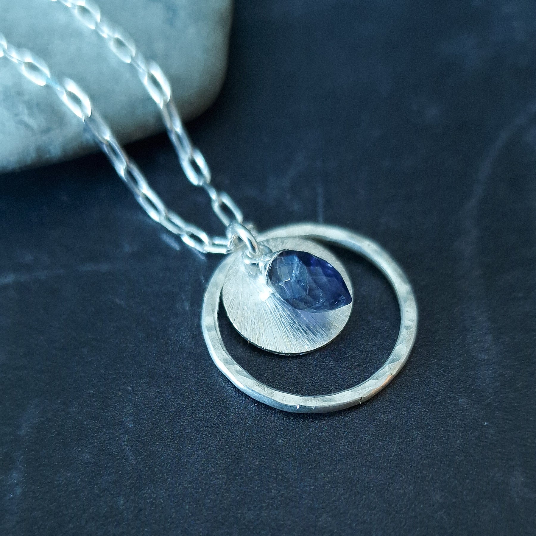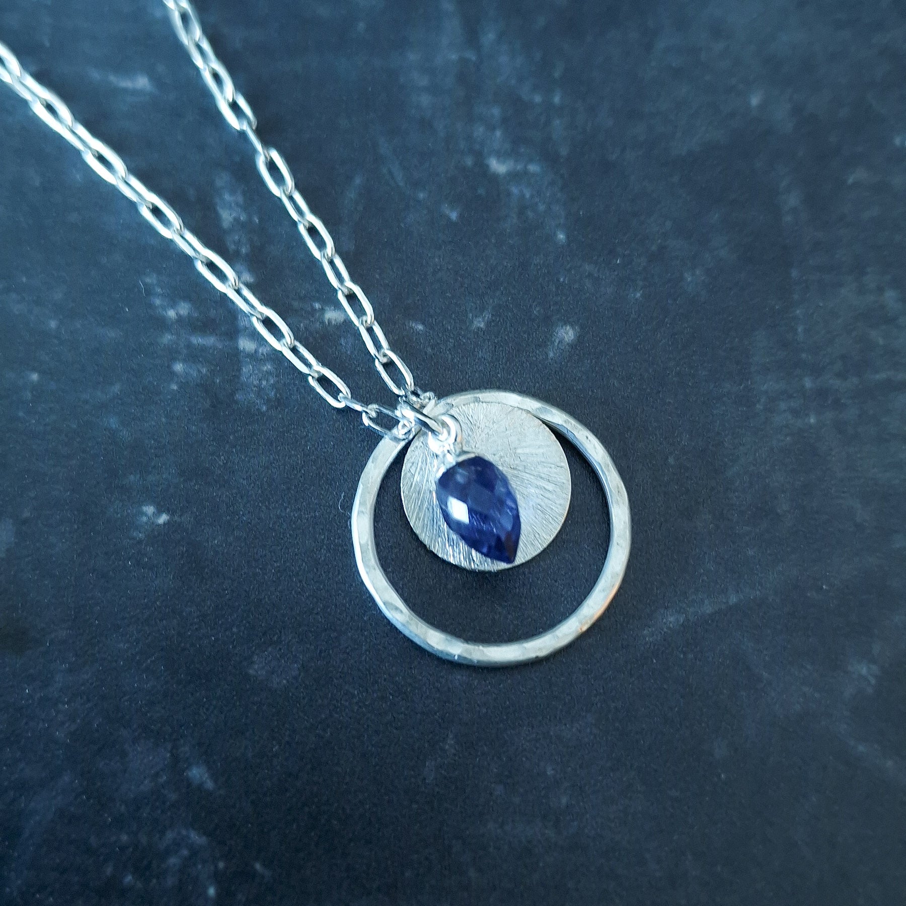 Iolite Circle Necklace in Sterling Silver - This exquisite Triple Pendant Necklace showcases a captivating Water Sapphire Charm (Iolite) at its centre. The Iolite gemstone, also known as the alternative birthstone for September, is admired for its deep, enchanting hues and is associated with the Zodiac signs of Libra, Sagittarius, and Taurus. The necklace also features a textured sterling silver disc, beautifully framed by a fused, hammered silver circle pendant, adding intricate details that make it truly unique.