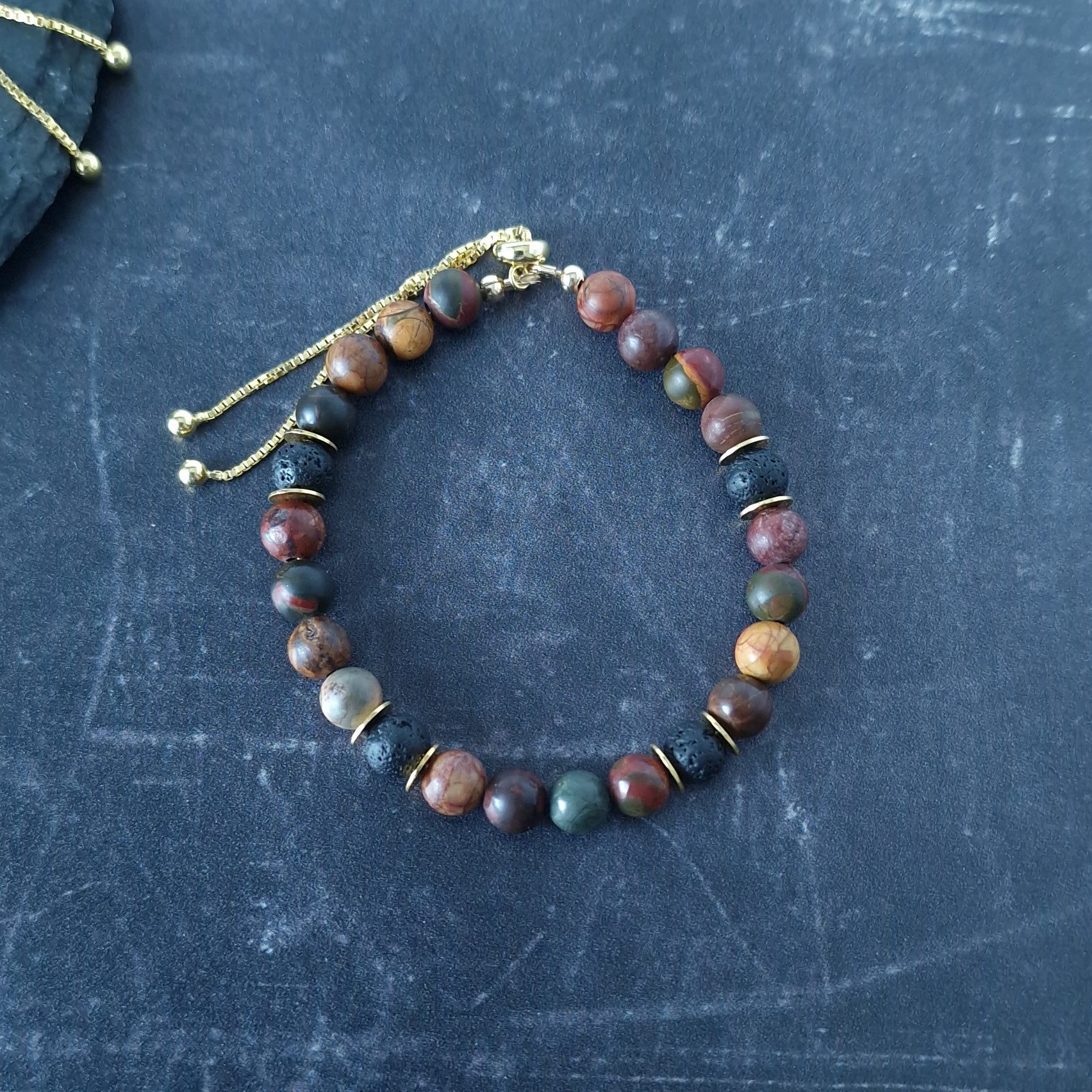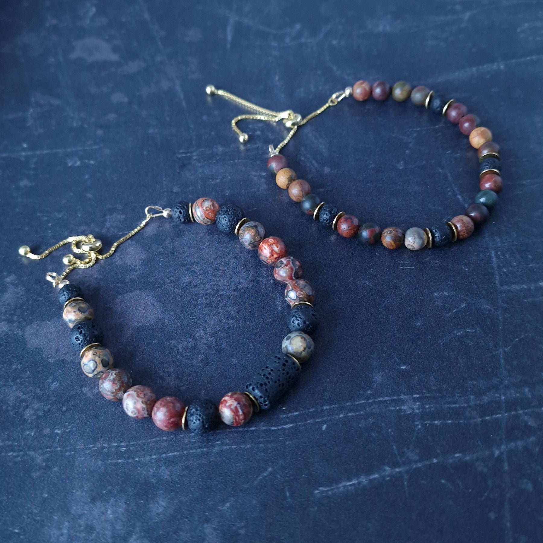 Both Jasper and natural stone bracelets are adjustable between 7 - 8 inches. Beads are 8mm and 6mm in size.