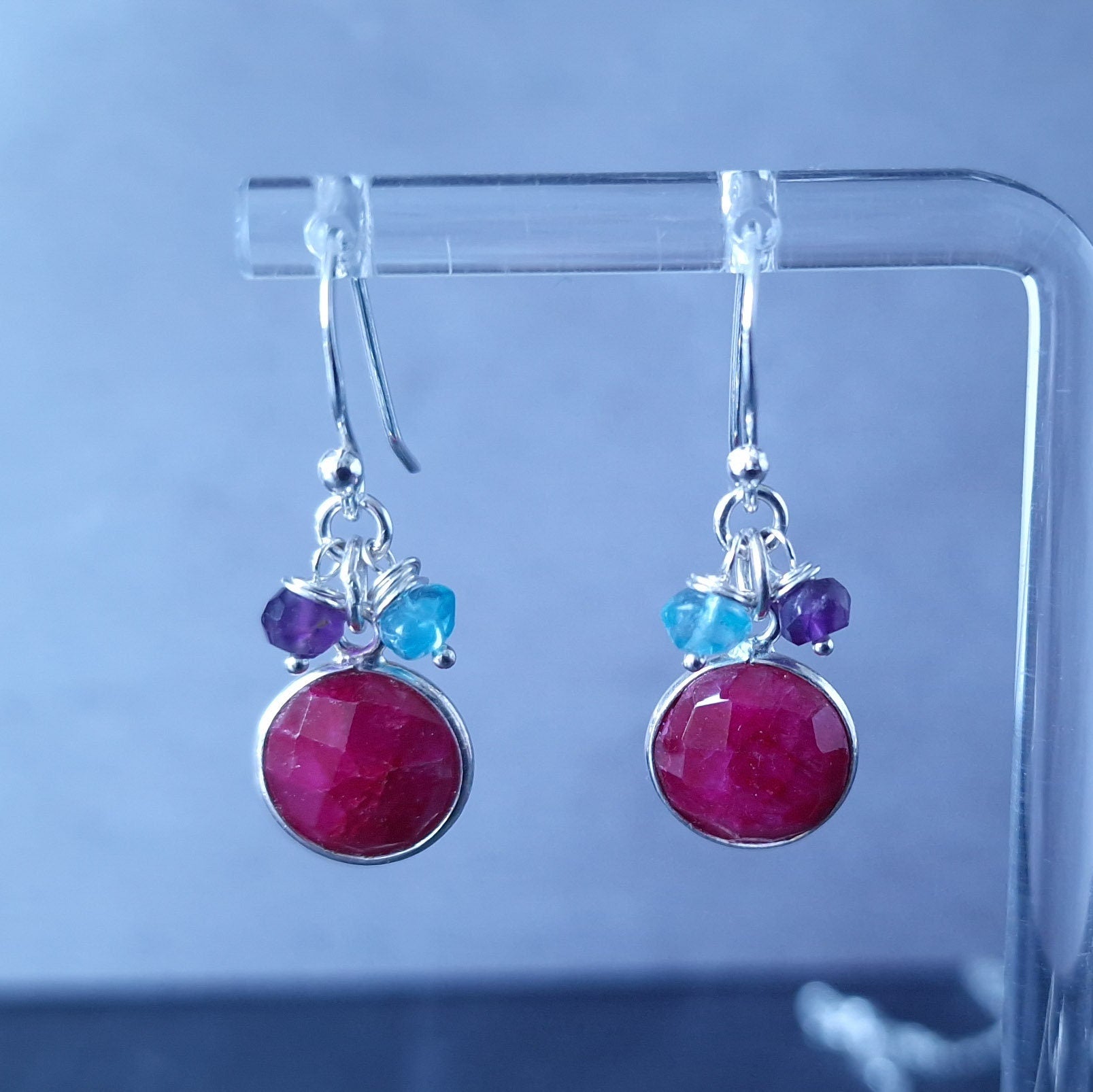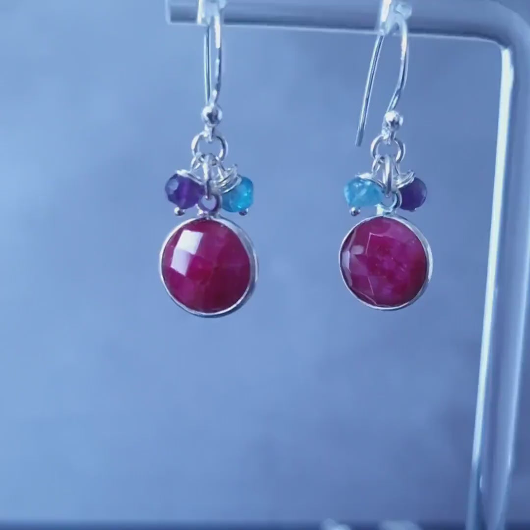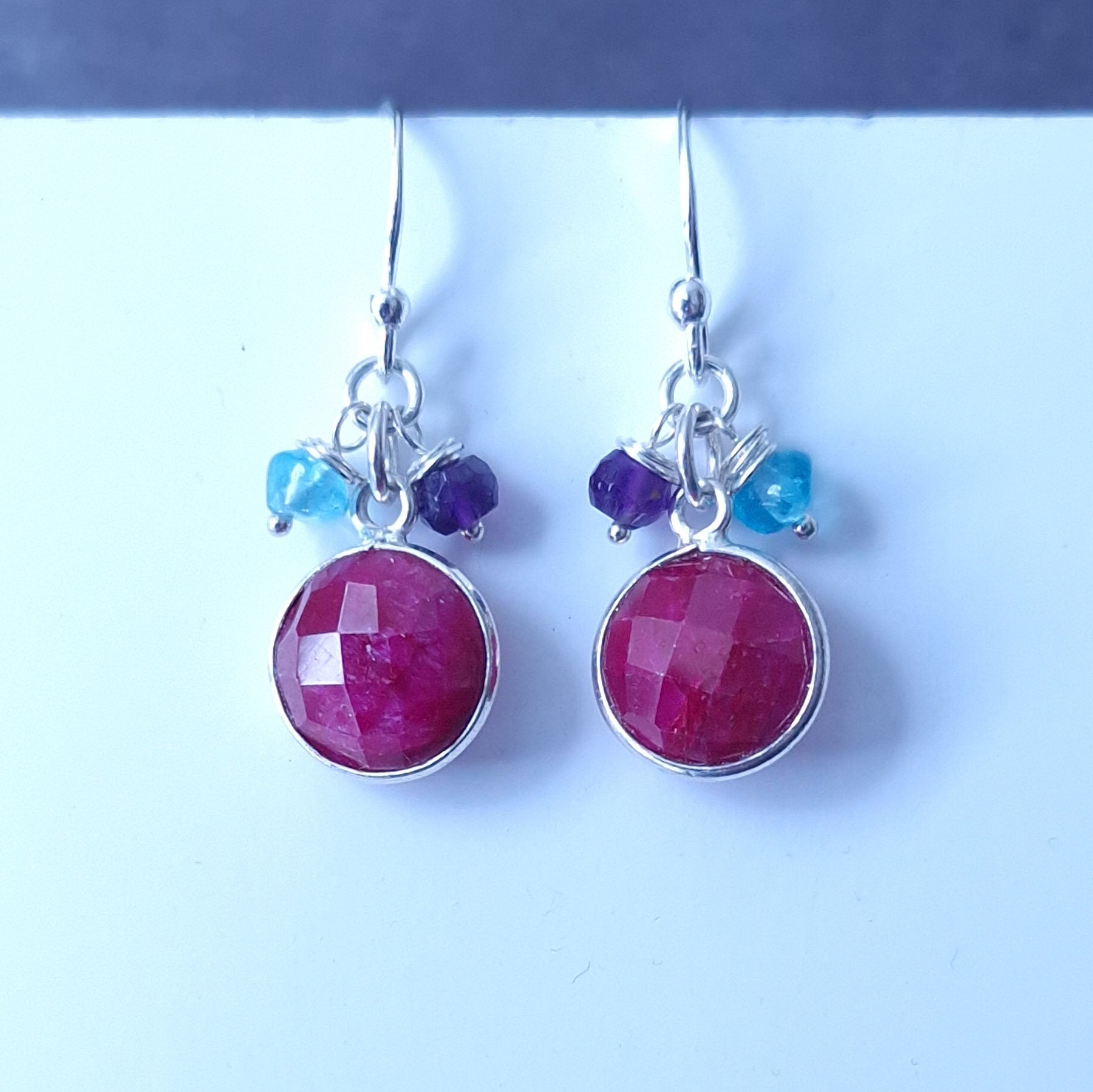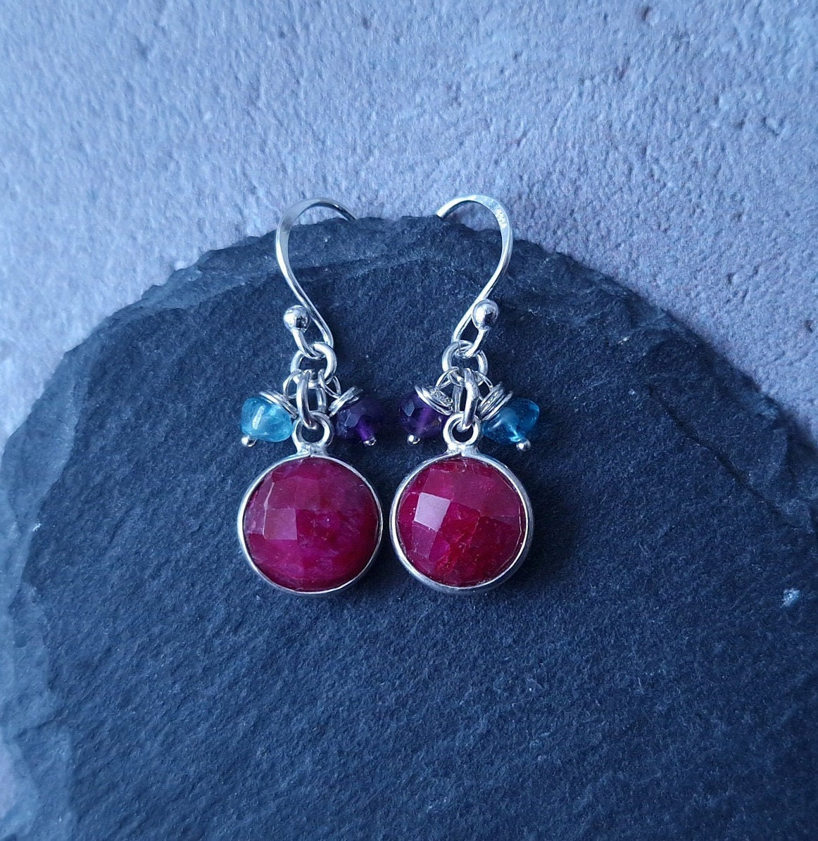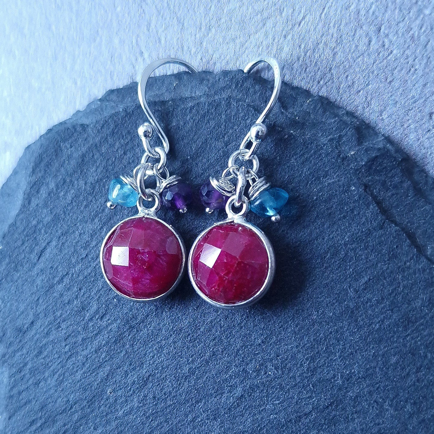Ruby Sterling Silver earrings - Sparkling faceted red ruby drop earrings in 925 Sterling Silver accented with blue apatite and amethyst drops. These gorgeous ruby gemstone earrings will add a bit of glamour to your outfit day or night!