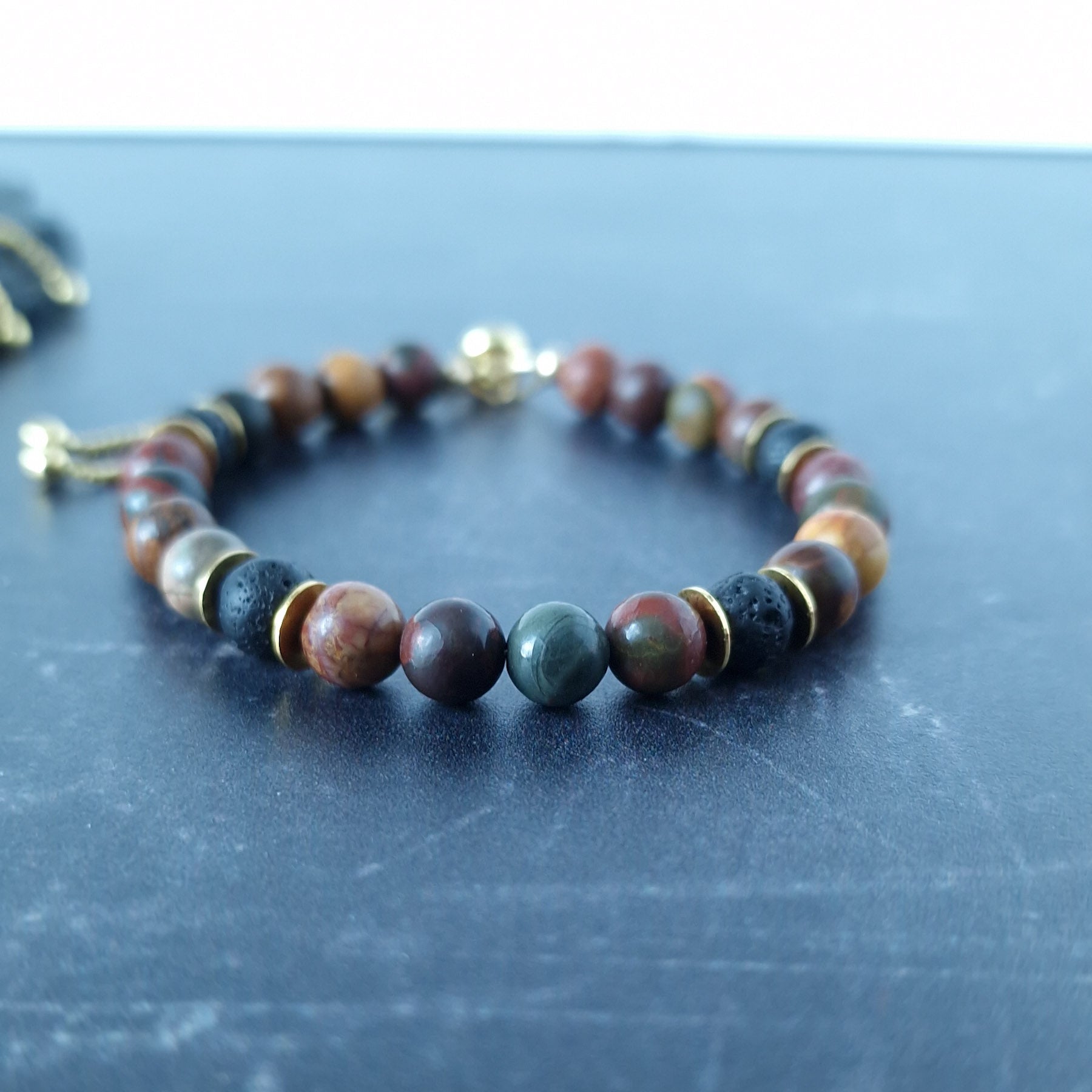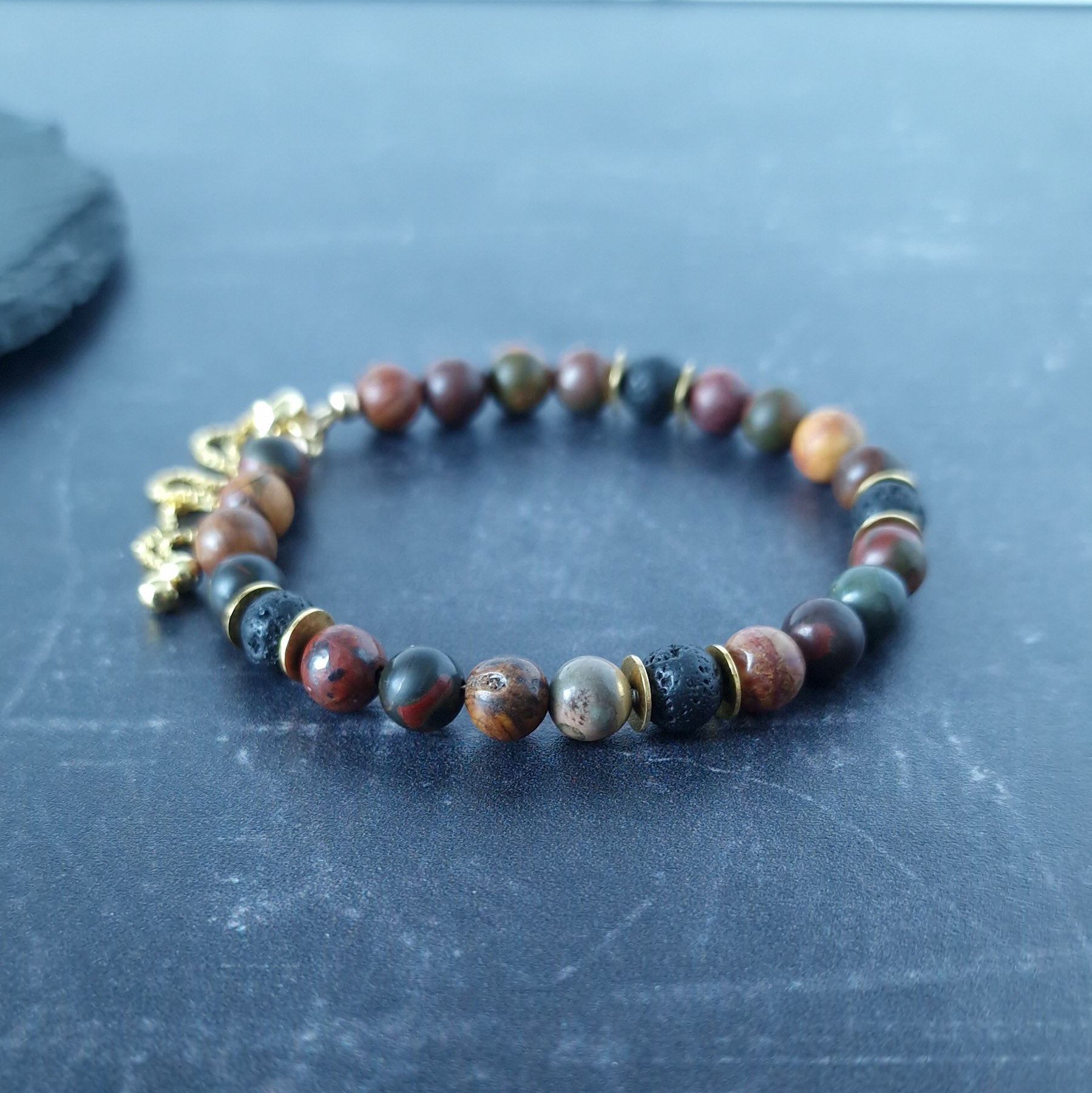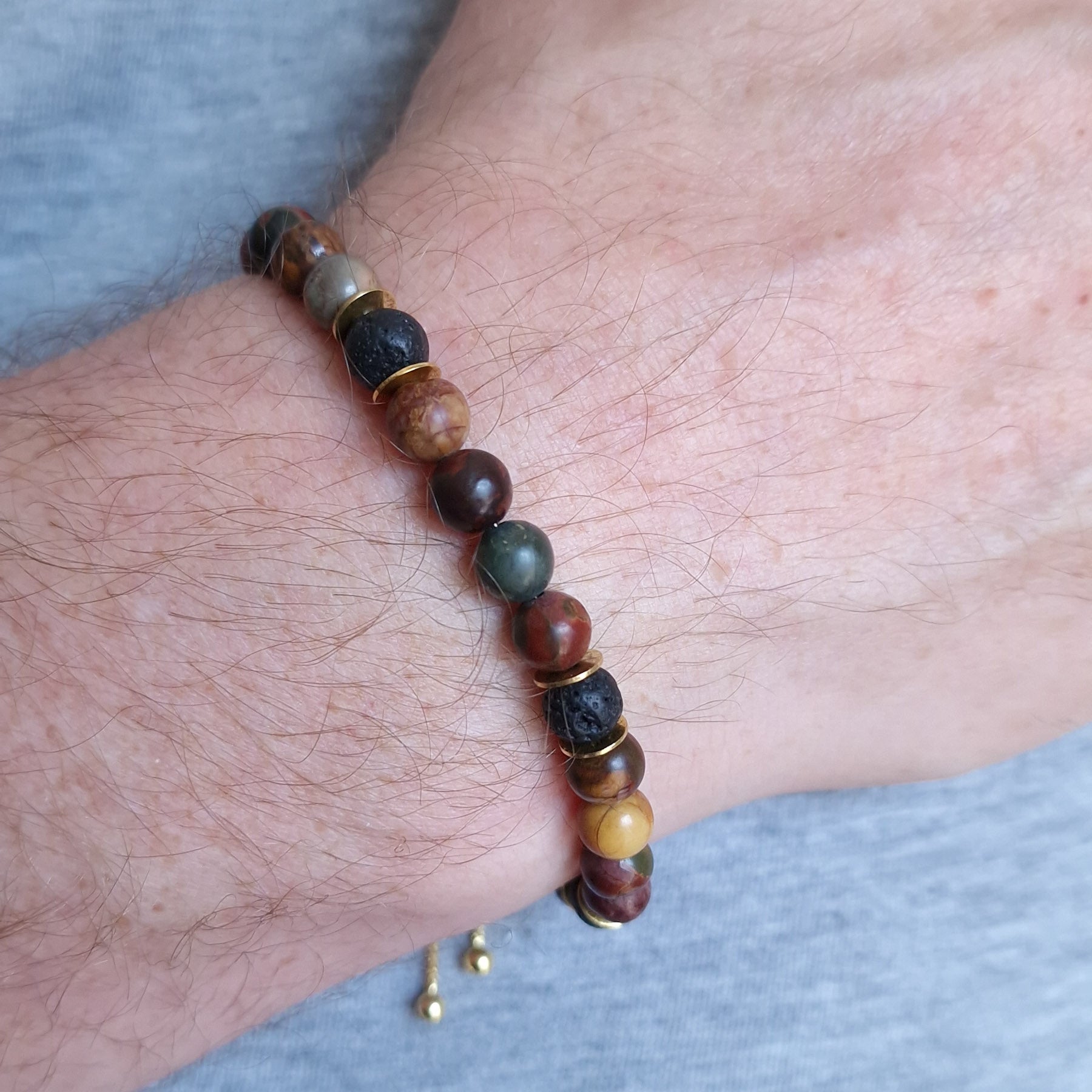 Men's Picasso Jasper bracelet in Gold Vermeil - this natural stone bracelet featured handstrung multi-coloured Jasper and lava stone beads accented with gold vermeil discs and a gold vermeil slide clasp. Easy to put on, this bracelet is perfect to wear on it's own or as part of a bracelet stack.