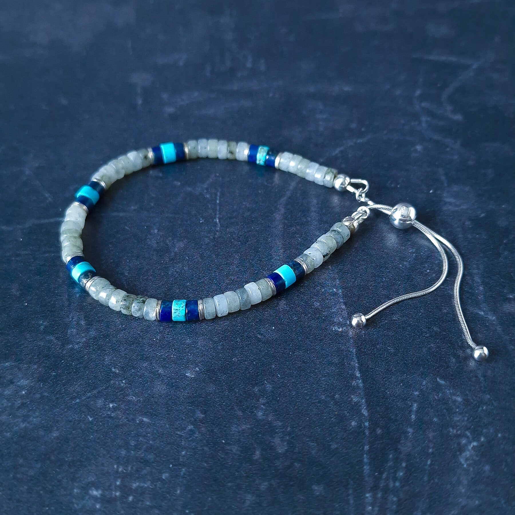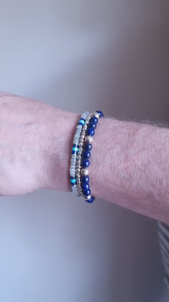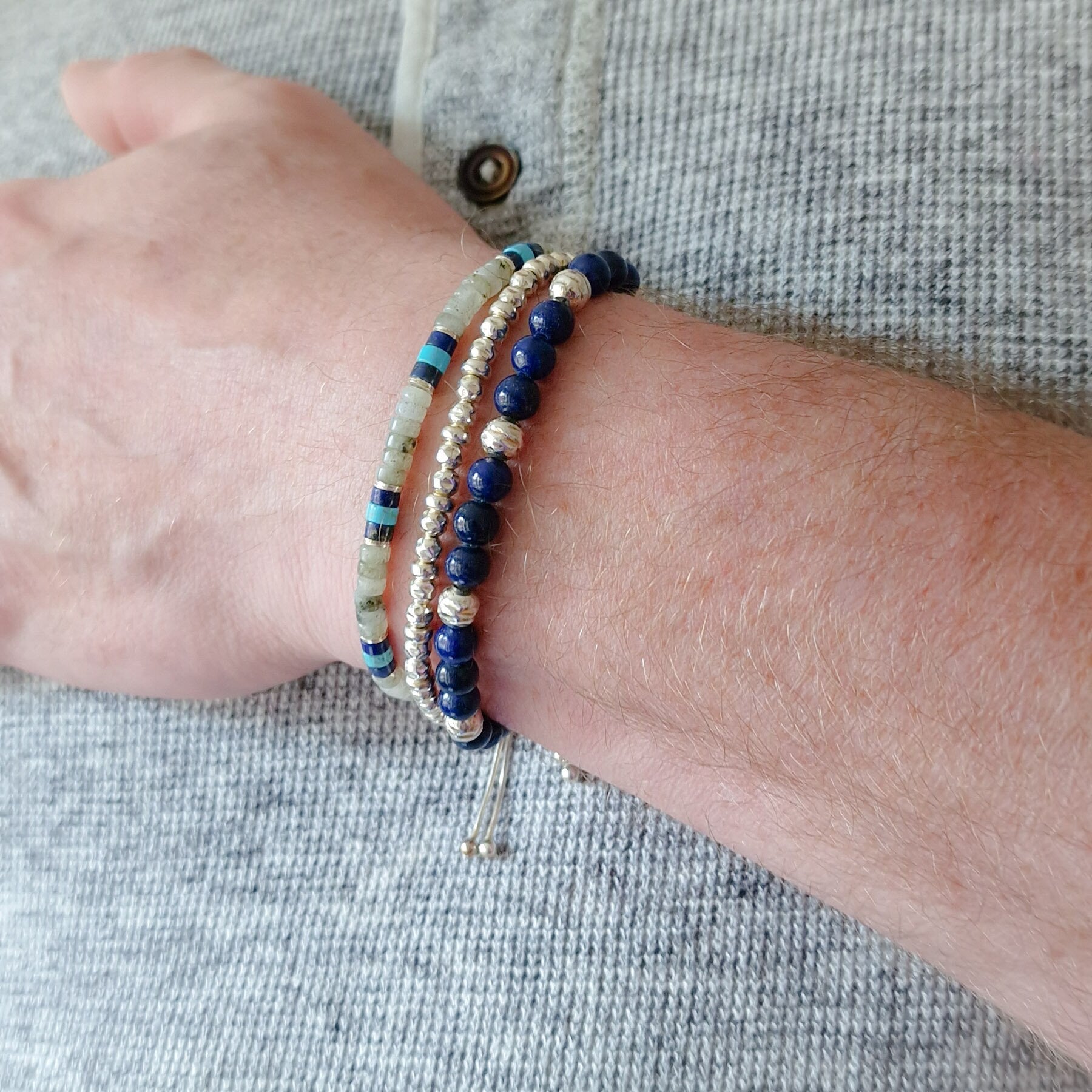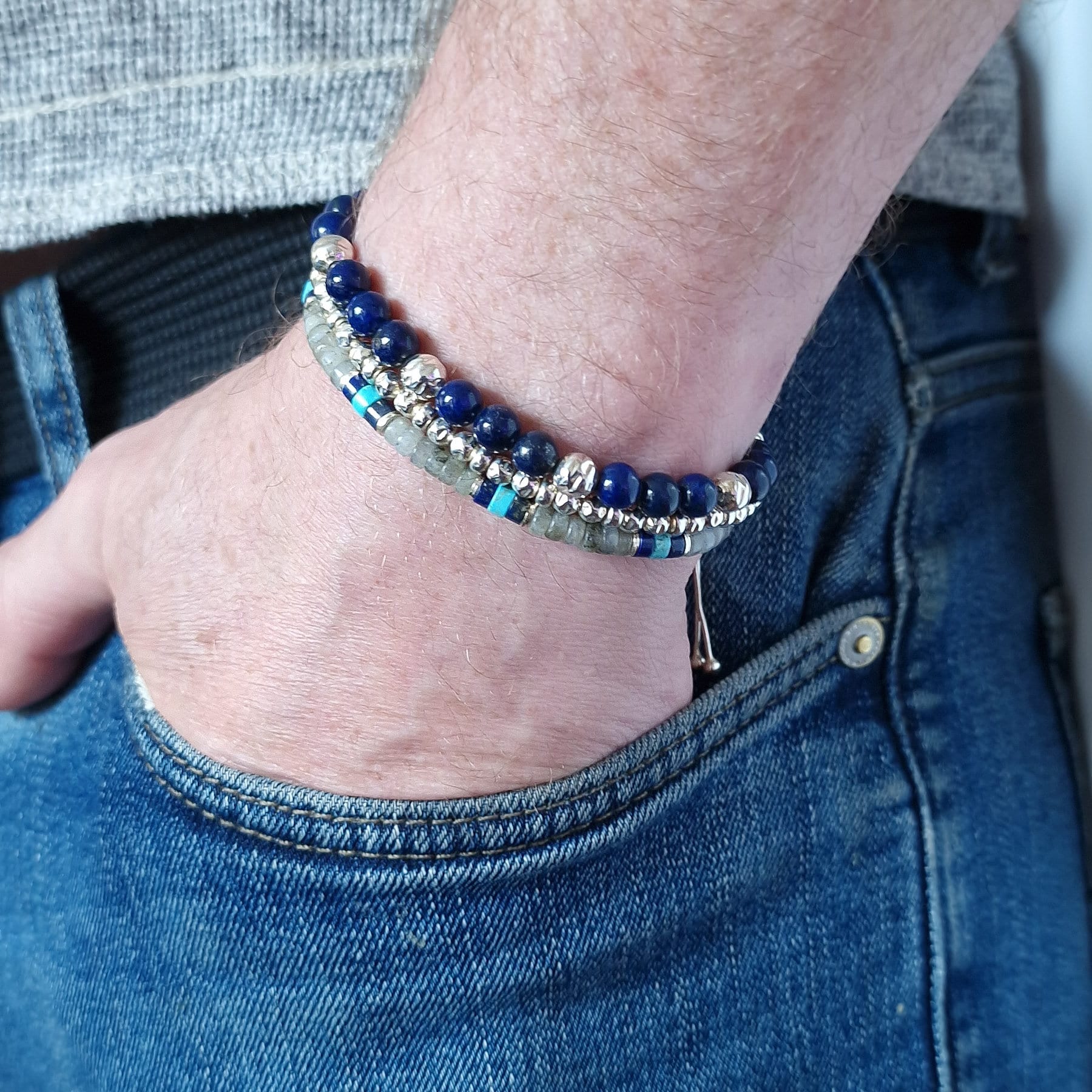 Men's luxury bracelet stack- features a set of three stacking bracelets for men. The first bracelet is the sterling silver turquoise slider bracelet - This handcrafted beaded bracelet is strung with turquoise, lapis lazuli, labradorite and sterling silver disc beads. The second bracelet is the Men's sterling silver slider bracelet. This bracelet is strung with 925 sterling silver rondelle and hammered beads, giving the jewellery a unique depth of texture. The third bracelet is strung with round deep blue lapis lazuli 6mm sized stones and large hammered sterling silver accent beads.