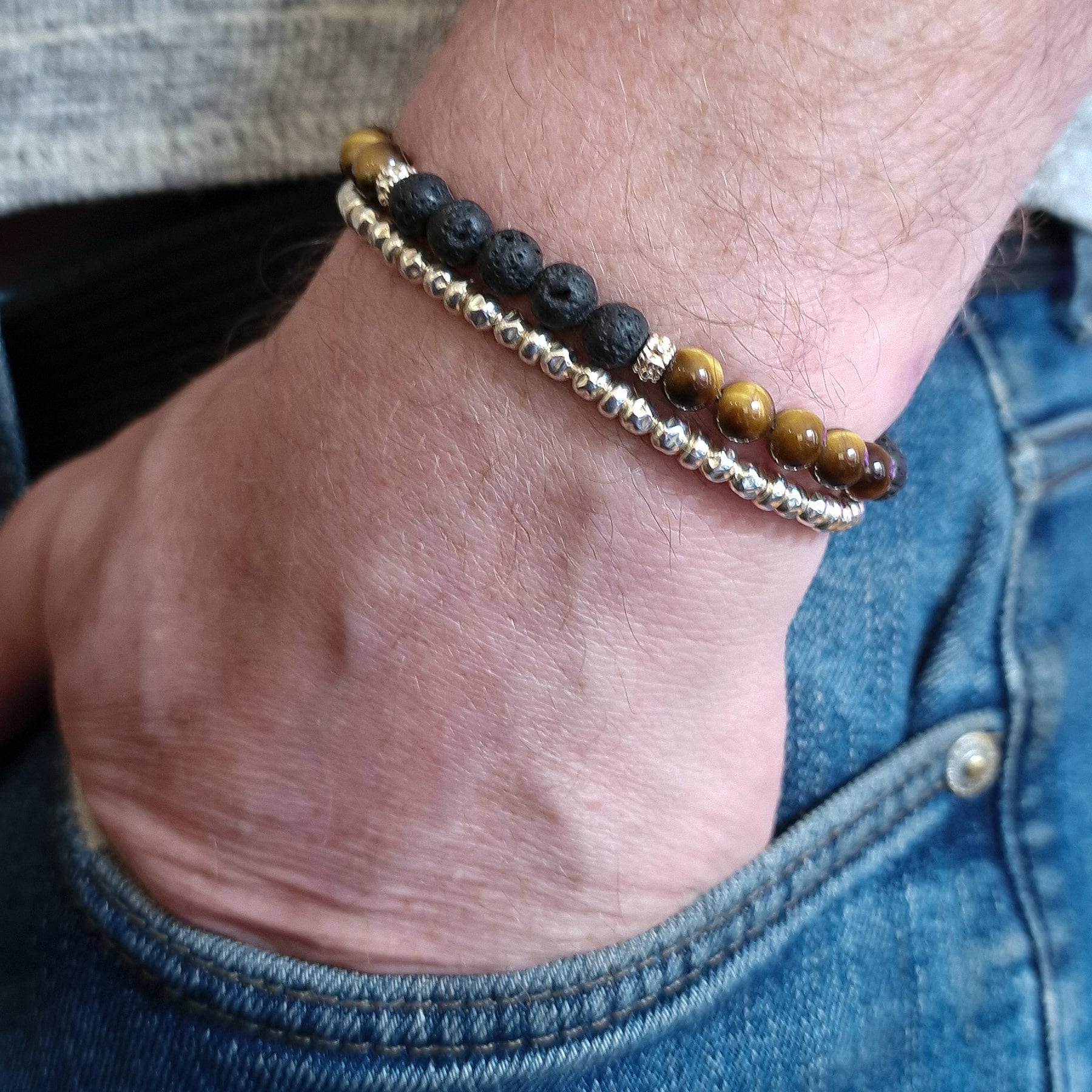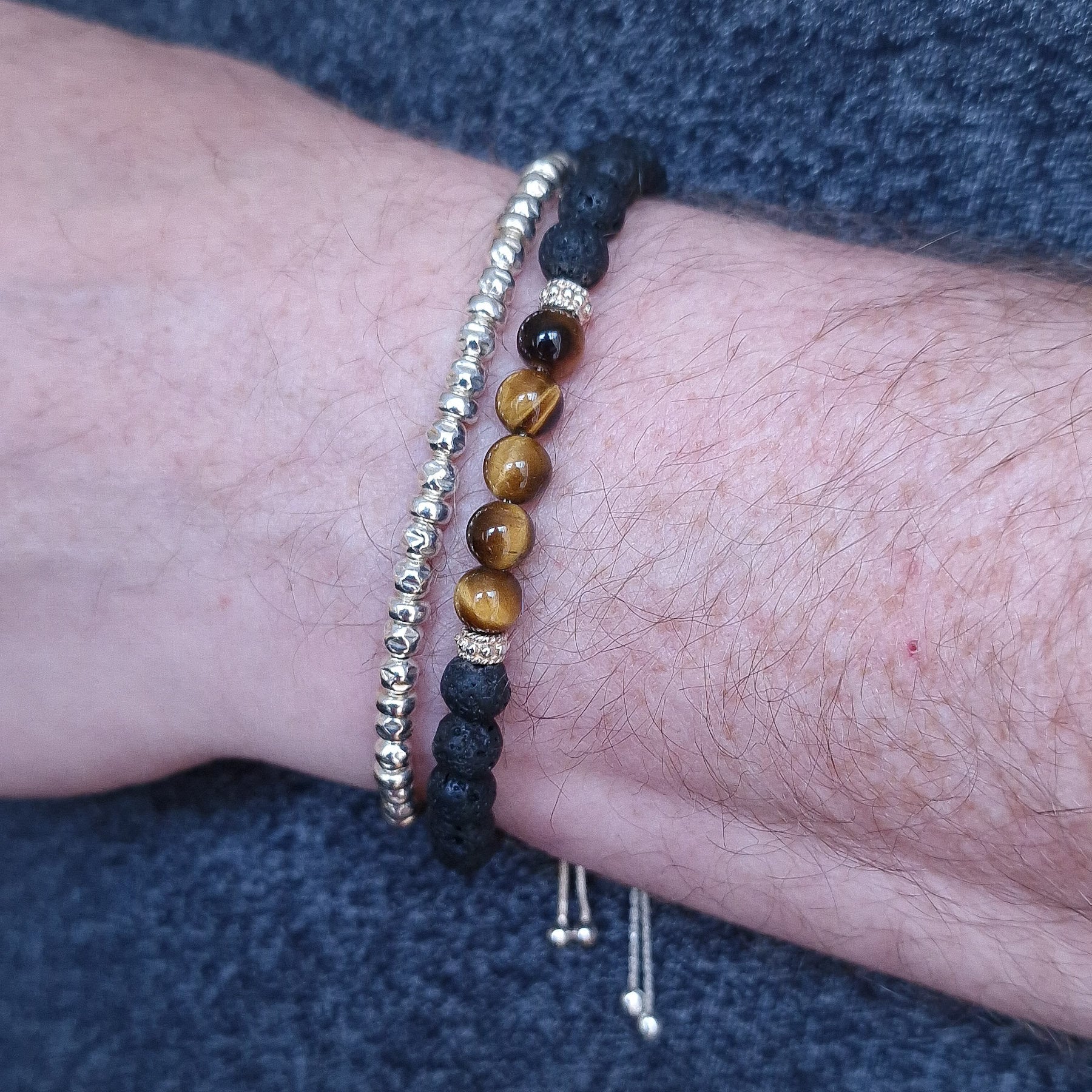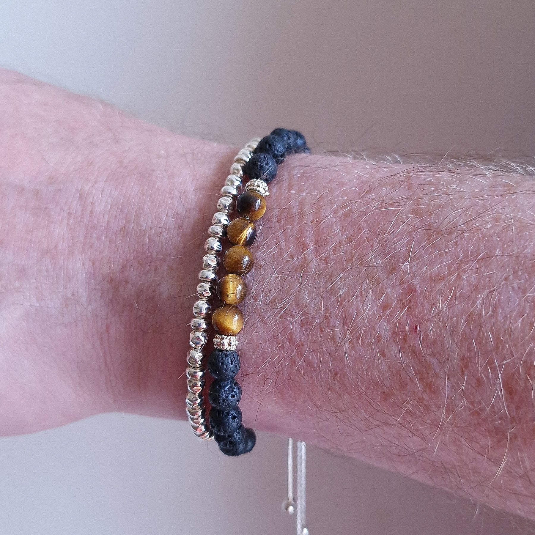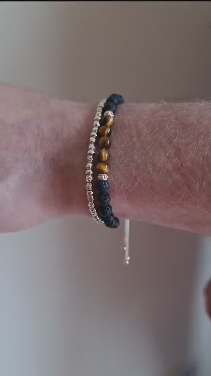 Tiger's Eye and Black Lava Rock men's sterling silver bracelet stack set of two - features a set of two stacking bracelets for men. The first bracelet is the Tiger's Eye and Black Lave Rock Slider bracelet. This handcrafted beaded bracelet is strung on a sterling silver chain with genuine tiger's eye, black lava rock and sterling silver cuff beads. The beads are approximately 6mm in size. The second bracelet is the Men's sterling silver slider bracelet. This bracelet is strung with 925 sterling silver rondelle and hammered beads, giving the jewellery a unique depth of texture.