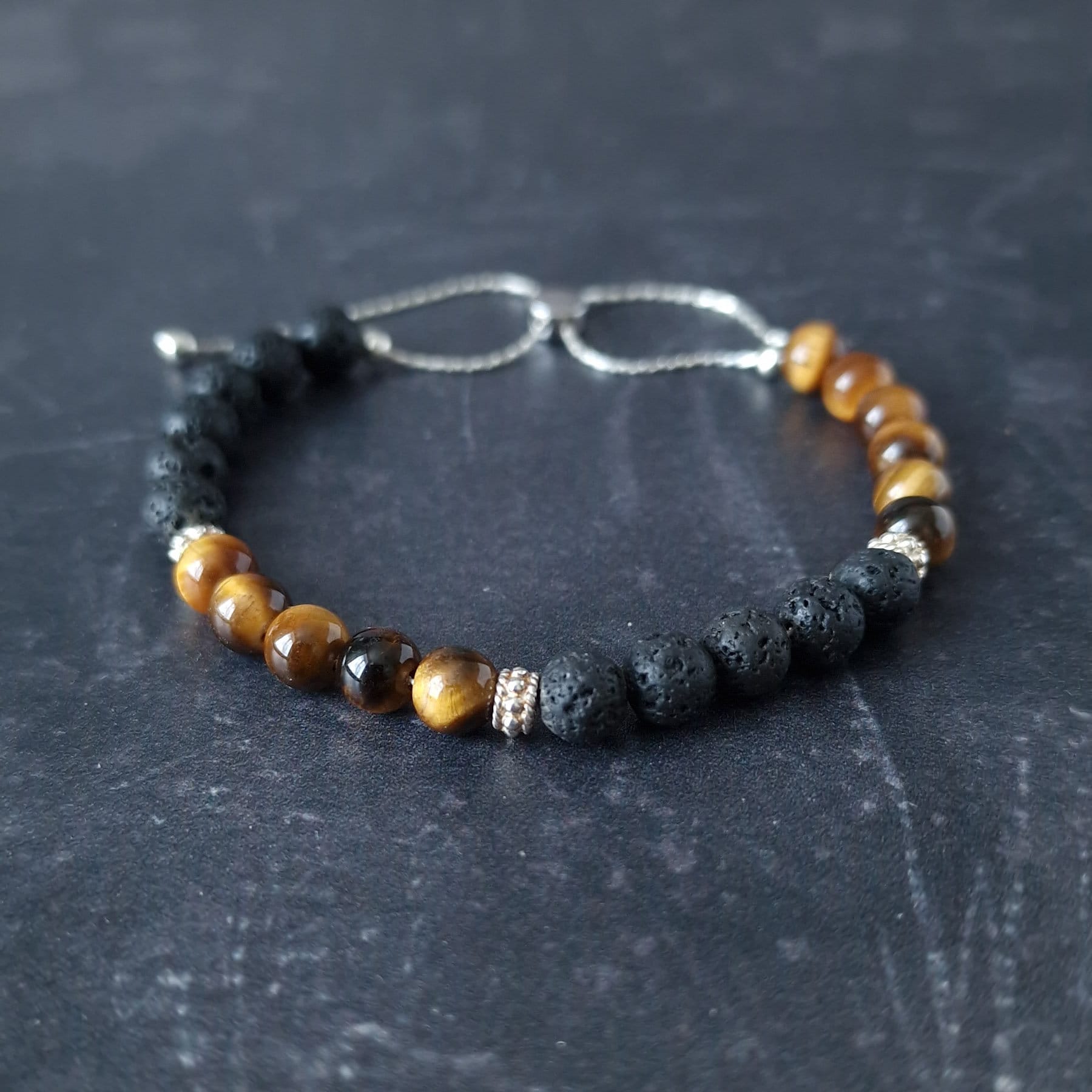 - 1 Tiger's Eye and Black Lava rock sterling silver beaded bracelet