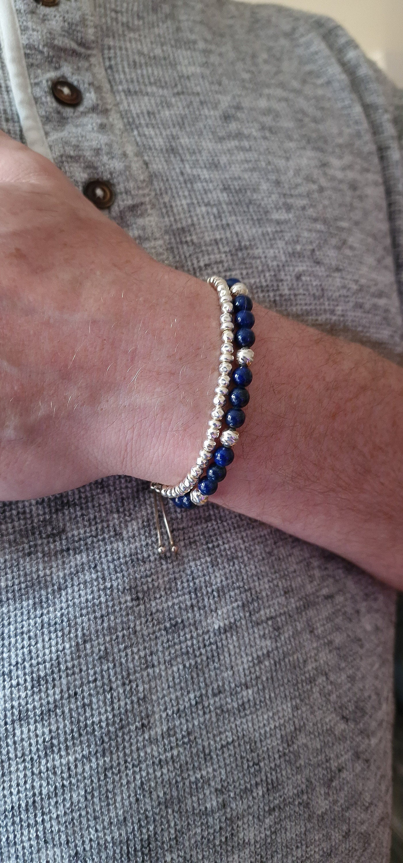 These stunning men's bracelets are adjustable with a chain extender on the lapis bracelet and a slider for the sterling silver bracelet.