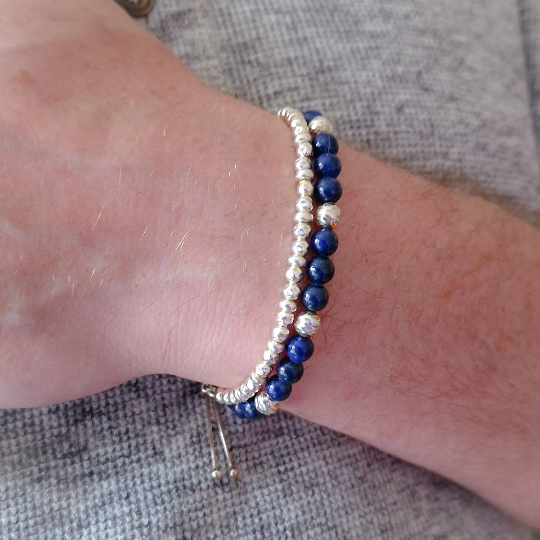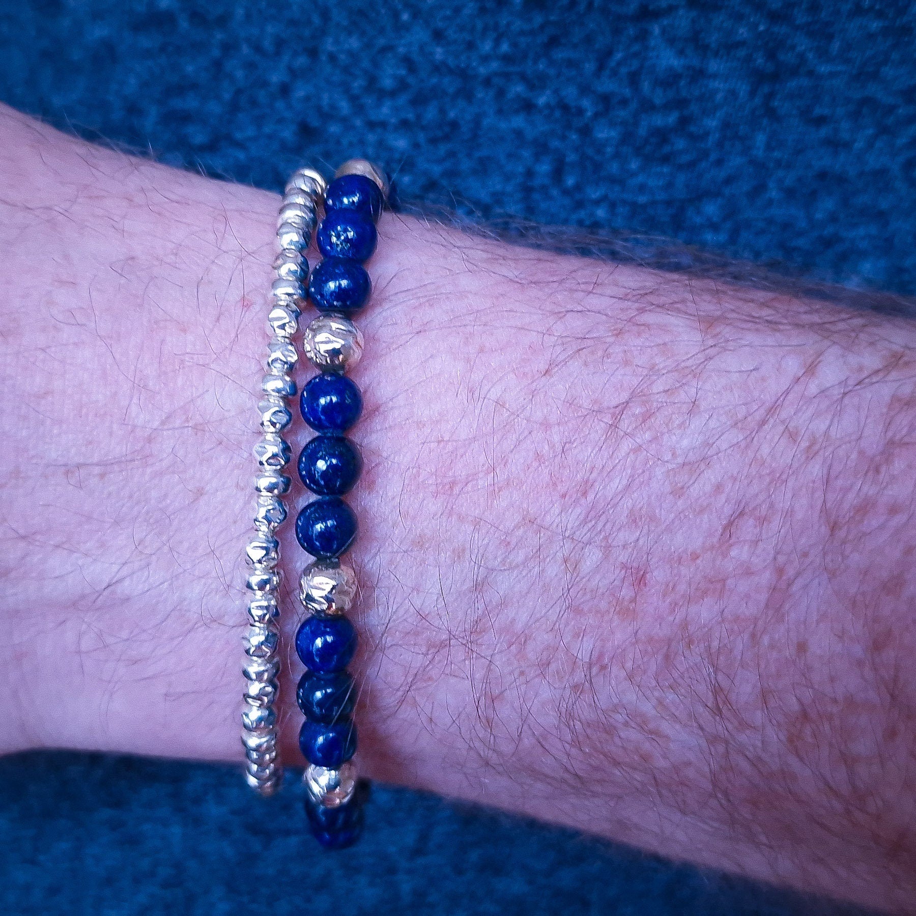 Lapis Lazuli men's sterling silver bracelet stack set of two - features a set of two stacking bracelets for men. The first bracelet is the deep blue lapis lazuli bracelet. This handcrafted beaded bracelet is strung with lapis lazuli and hammered sterling silver 6mm round beads. The second bracelet is the Men's sterling silver slider bracelet. This bracelet is strung with 925 sterling silver rondelle and hammered beads, giving the jewellery a unique depth of texture.