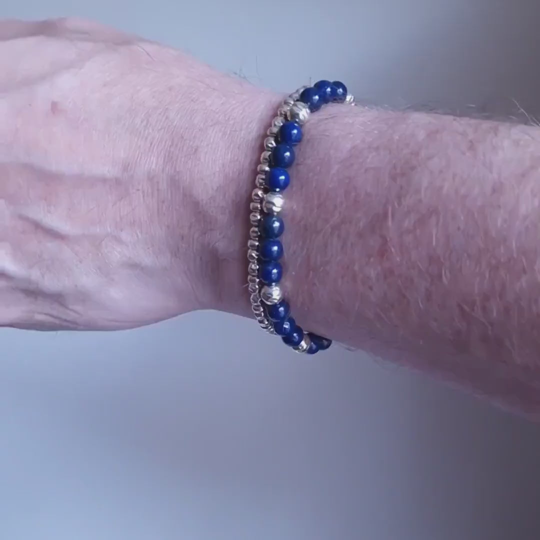 Mens sterling silver bracelet stack set of two, Lapis Lazuli beaded bracelet men, sterling silver stacking bracelet men's stone bracelet