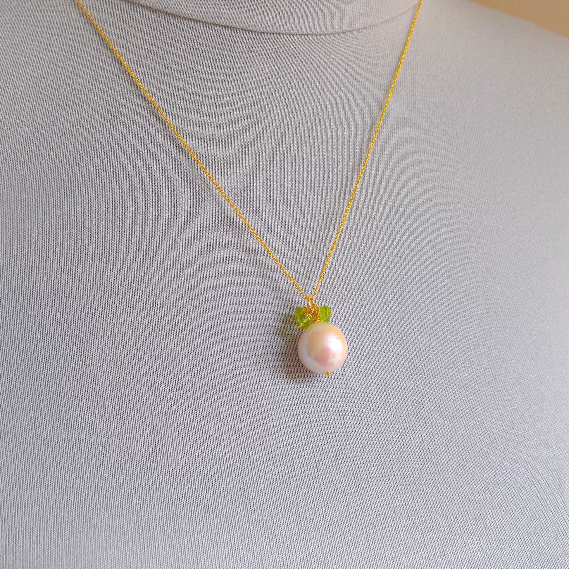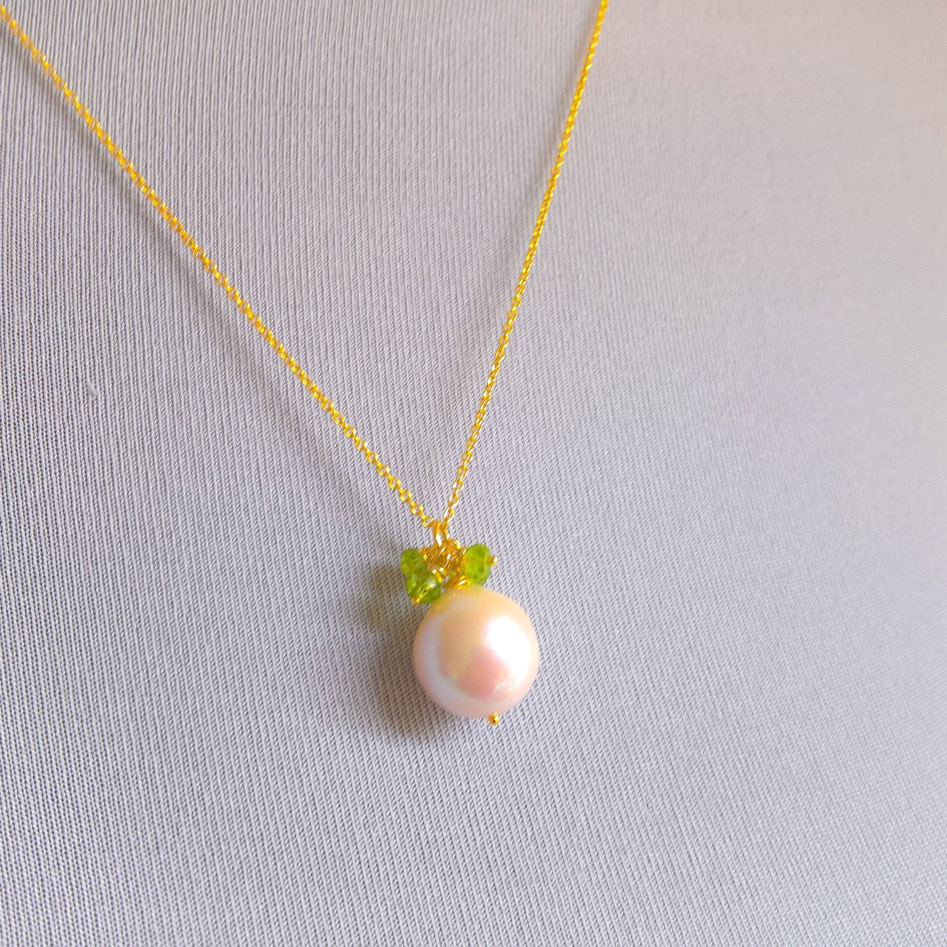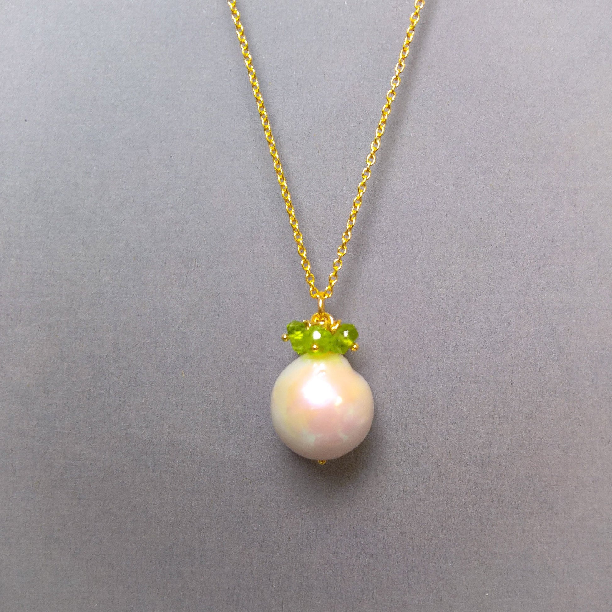 Pearl and peridot gemstone cluster necklace - features dainty facetted peridot clusters over an almost round baroque pearl hanging from a delicate gold vermeil chain. Make a statement with this delicate gemstone cluster pendant.