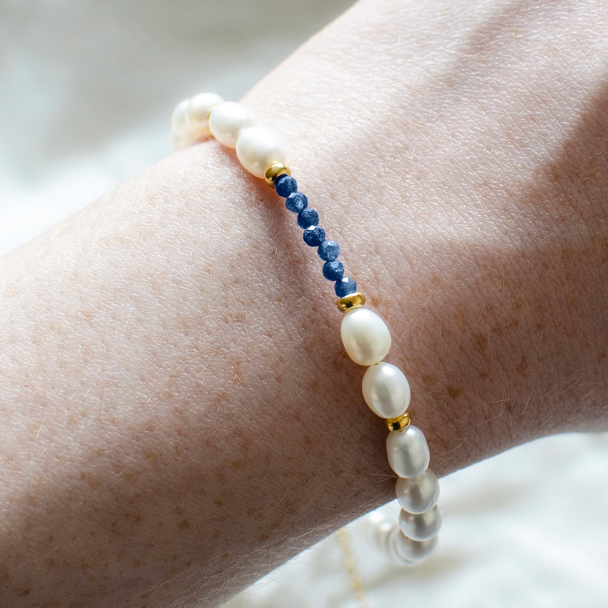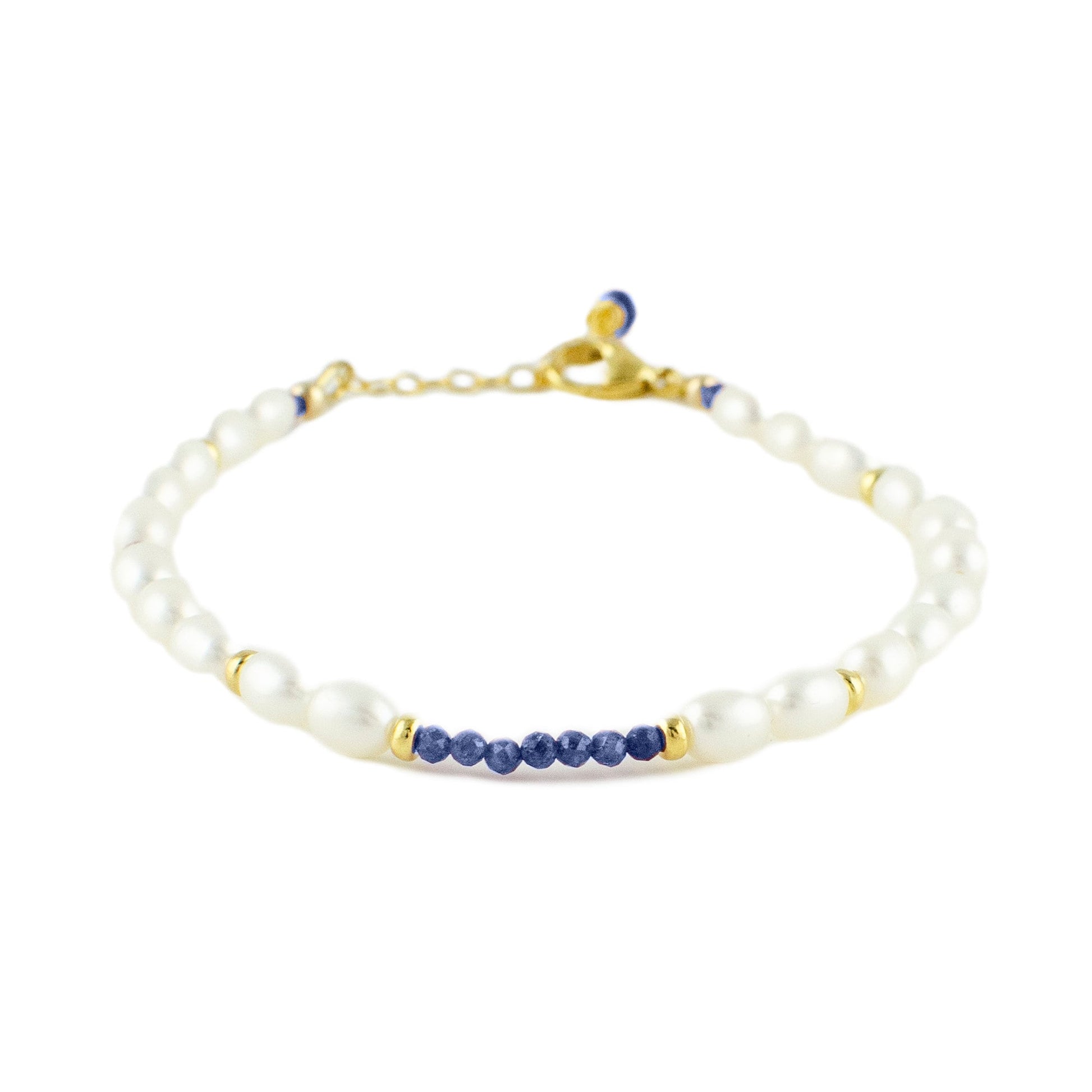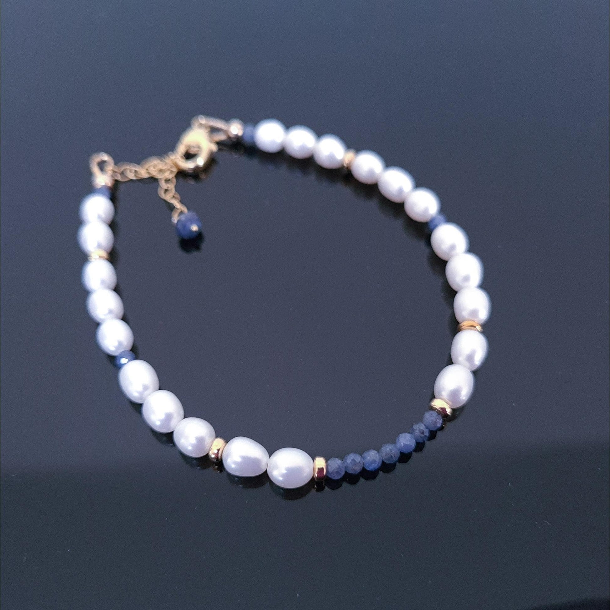 Pearl and sapphire bracelet in gold vermeil silver - This dainty freshwater pearl and sapphire bracelet will look elegant on its own or with other stacking bracelets. Sparkling blue sapphire facetted and gold vermeil beads accent rice-shaped freshwater pearls beads. This would make a lovely addition to your bridal or bridesmaid jewellery. This bracelet is adjustable between 7.5 to 8 inches.