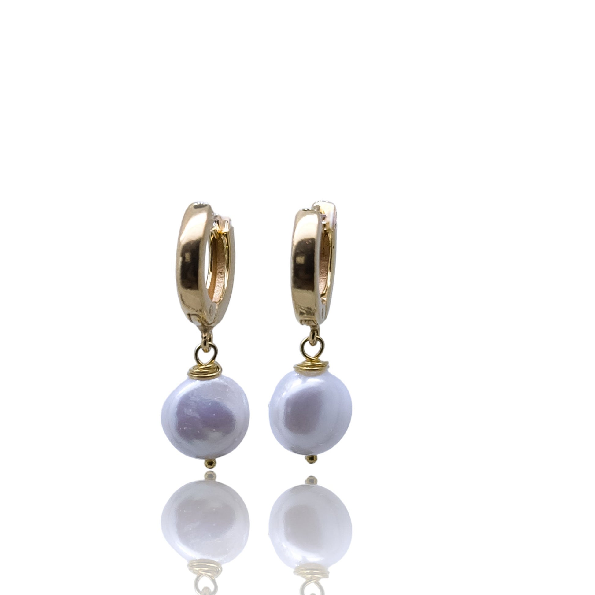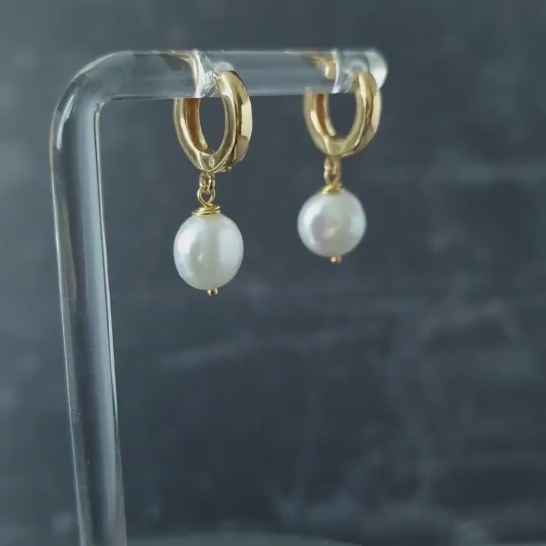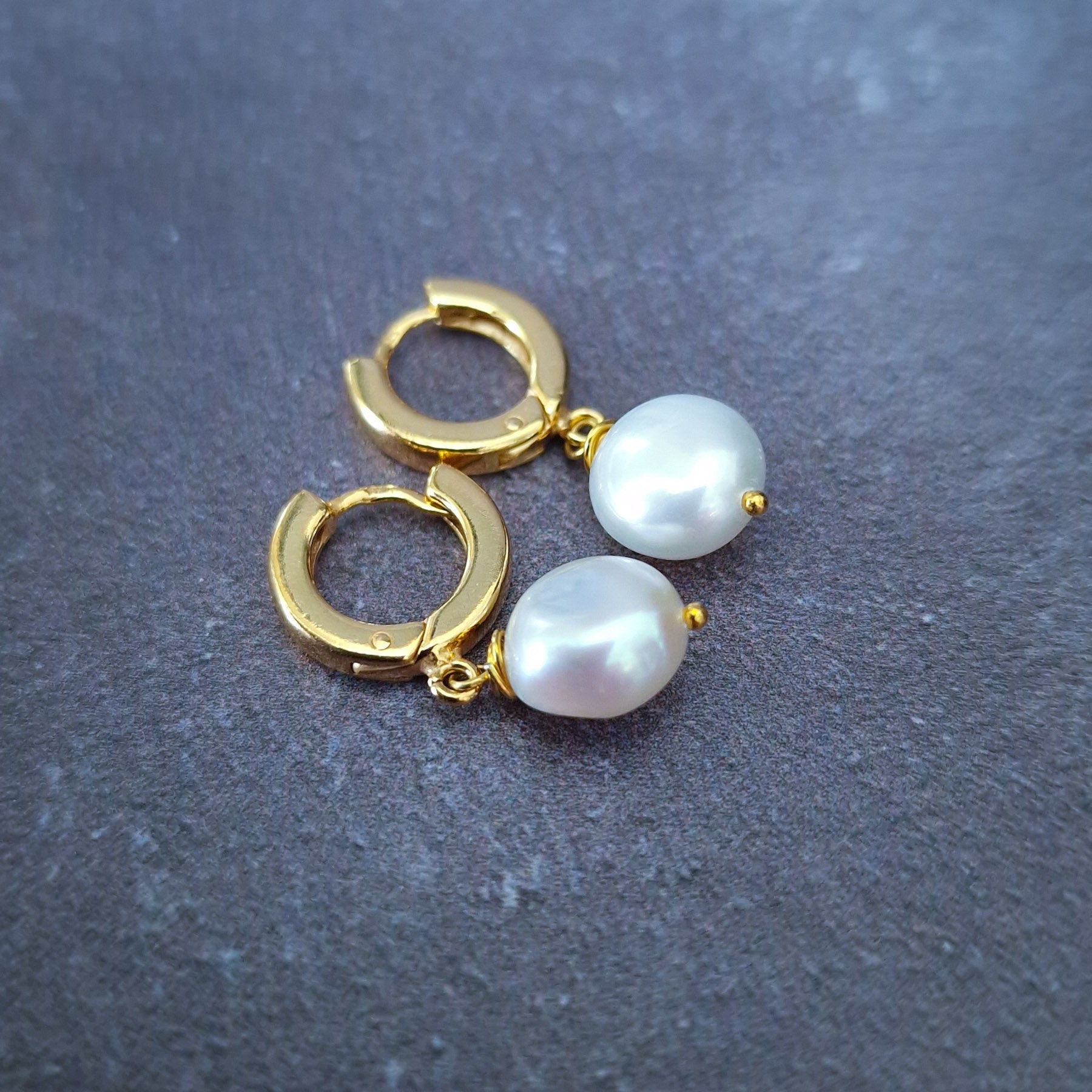 Pearl Huggie Hoop Earrings in Gold Vermeil - dainty freshwater button pearls hang off gold vermeil silver huggie hoop earrings. These stunning hoop earrings bring sophistication to any outfit.