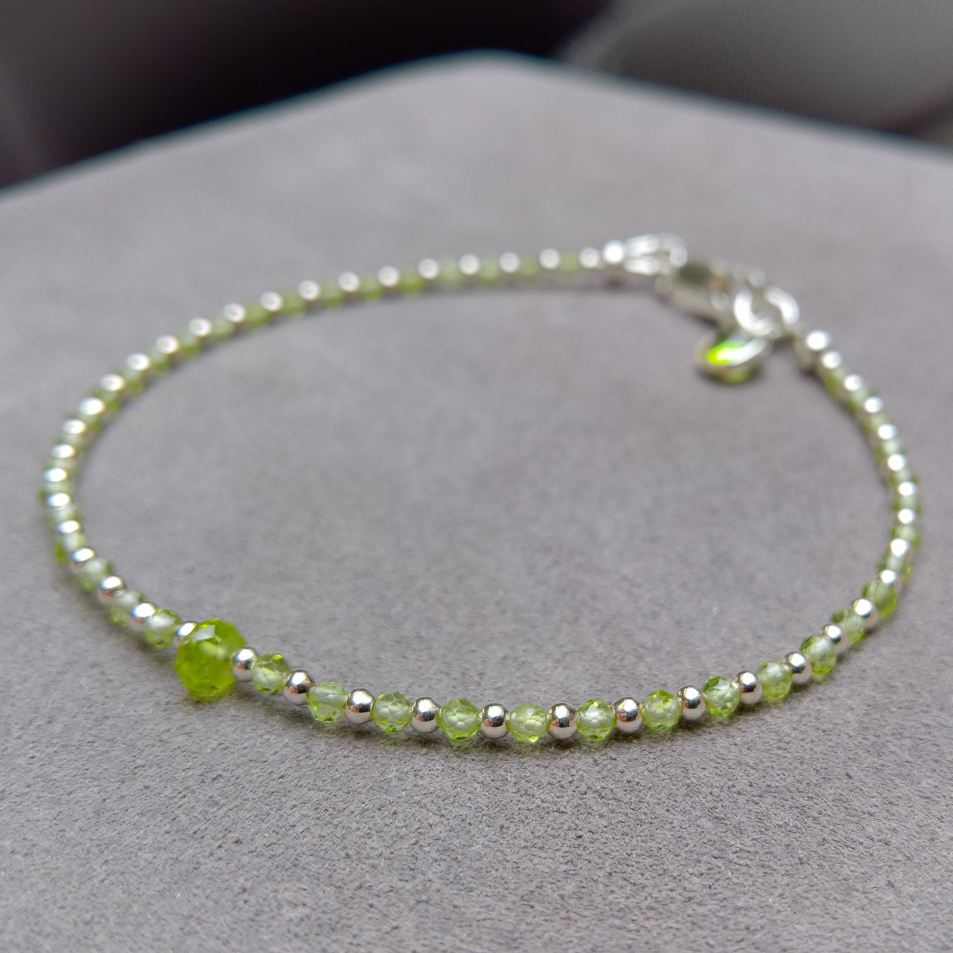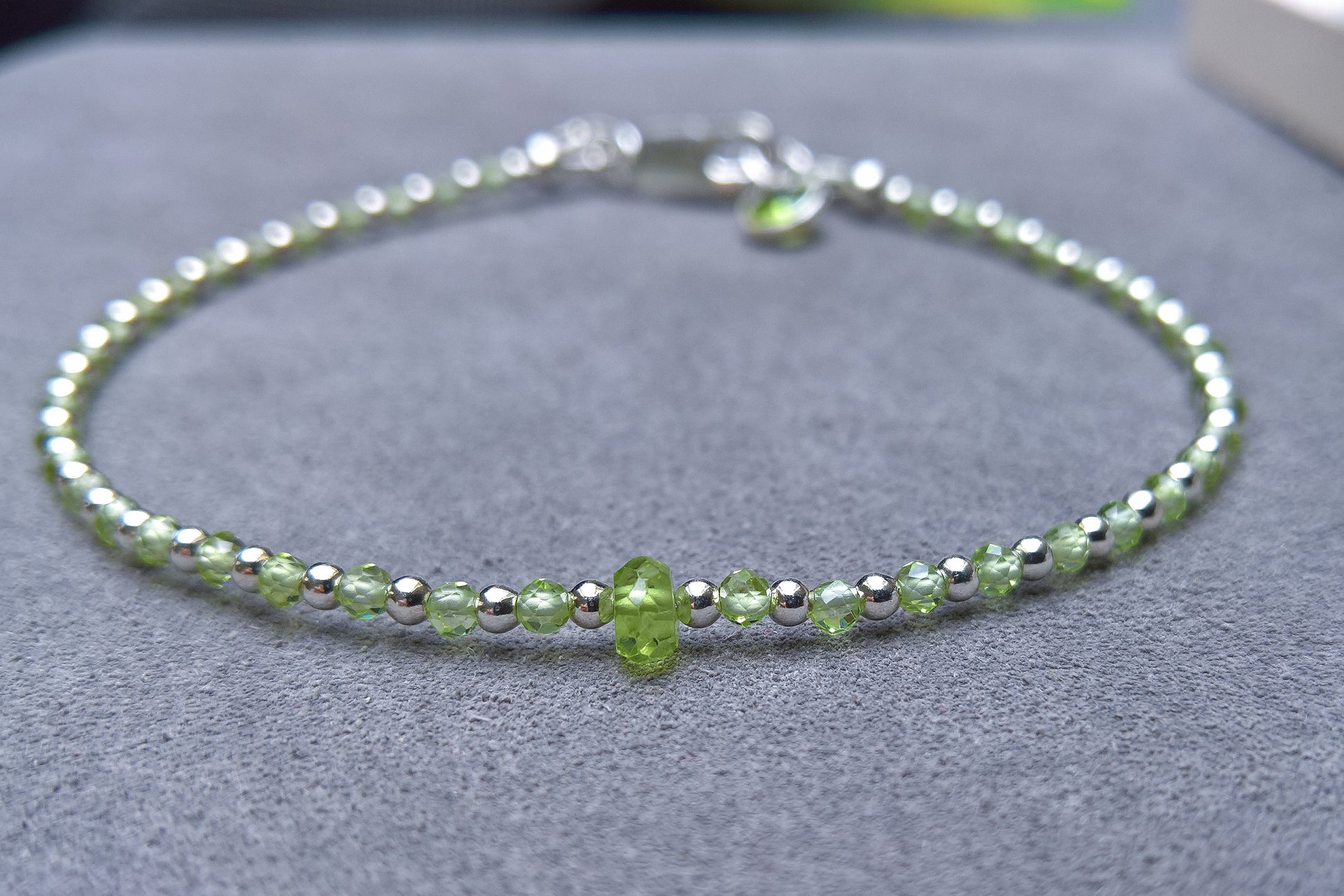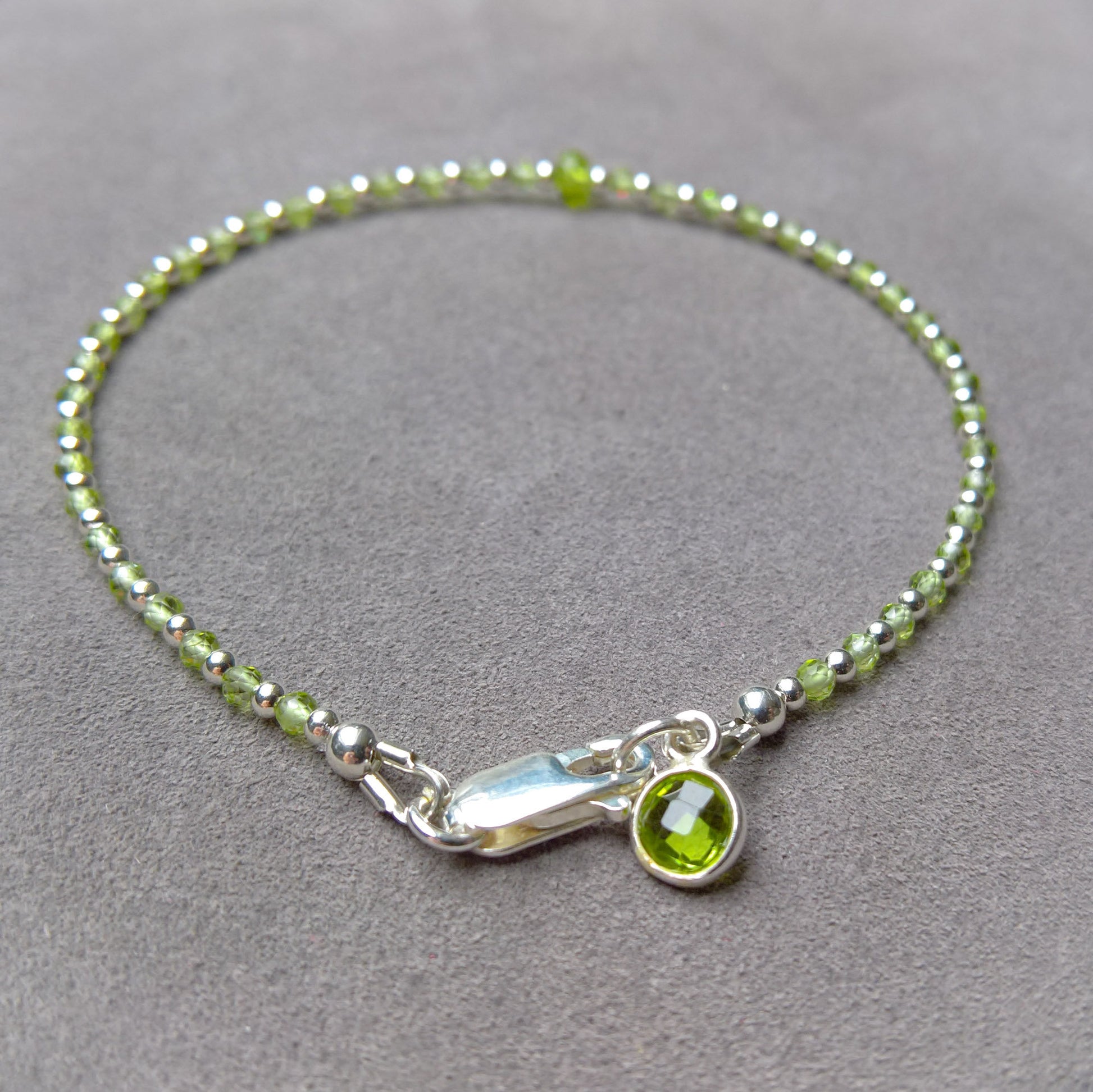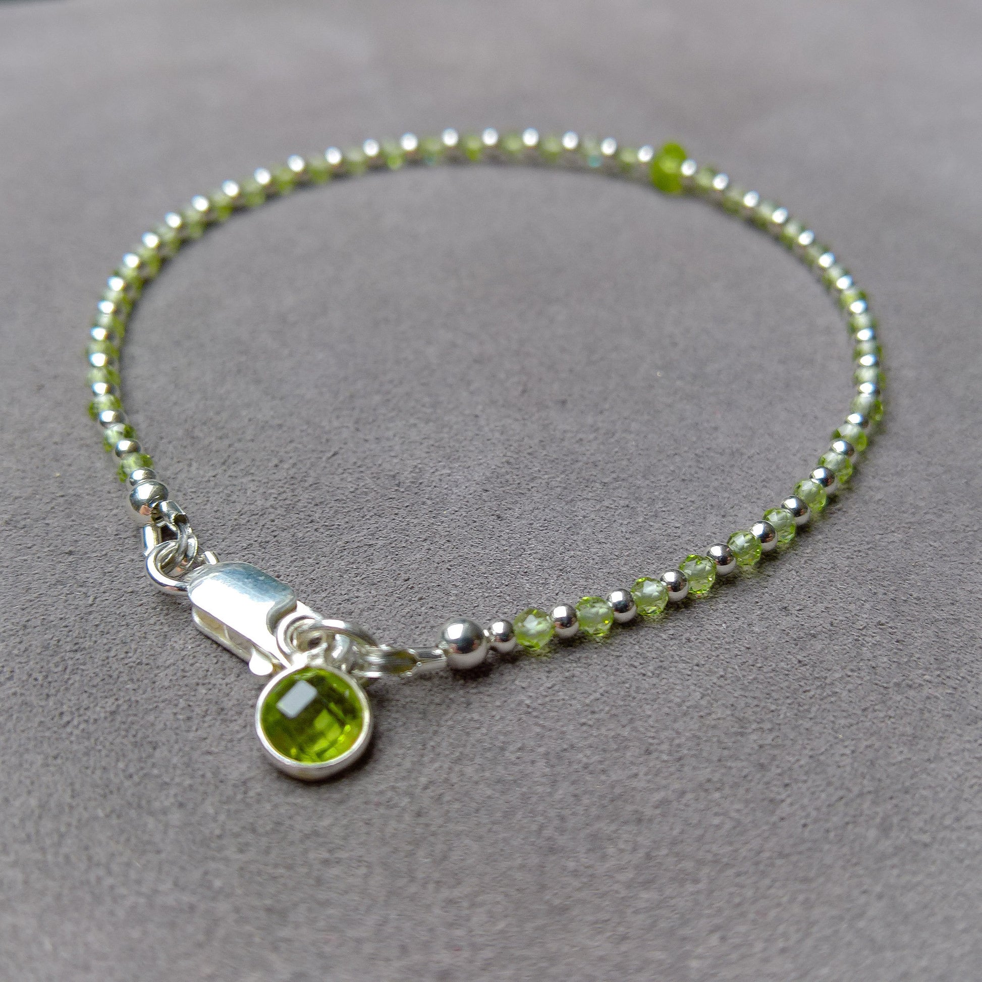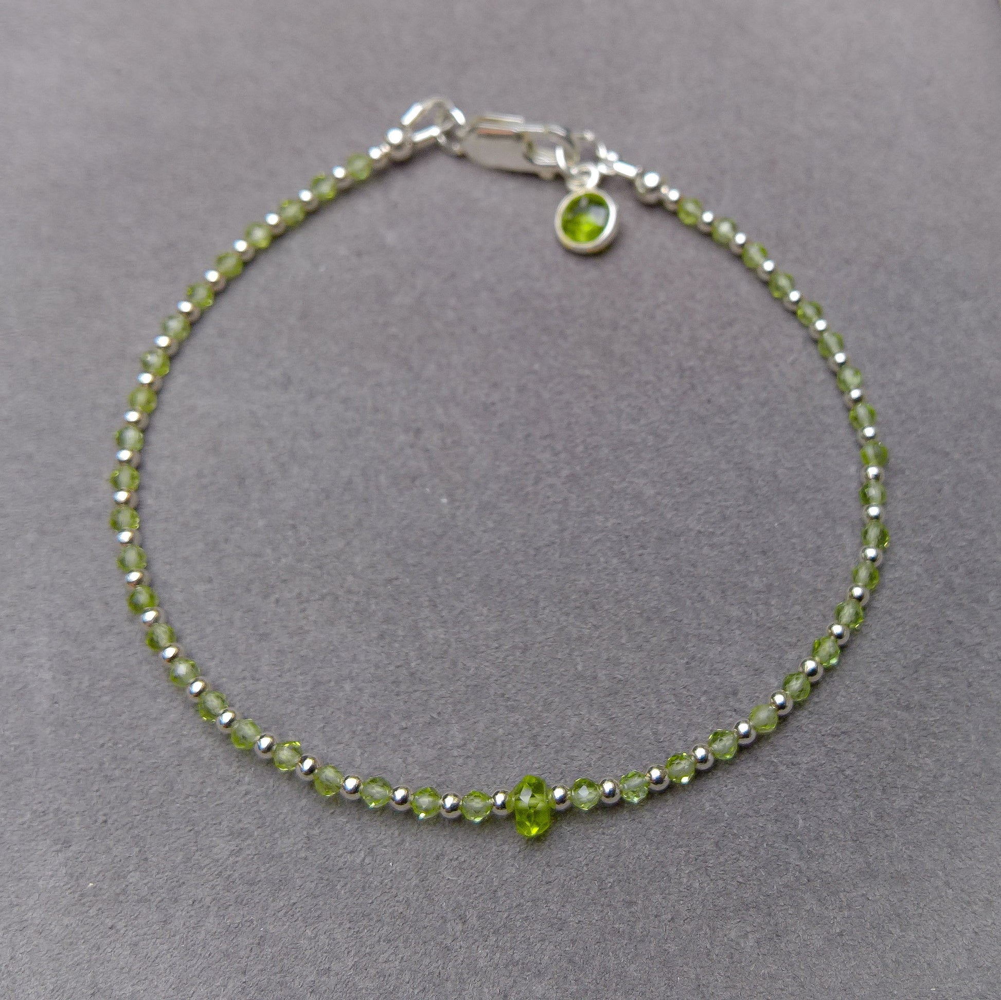 Peridot bracelet sterling silver - this dainty bracelet features sparkling green peridot gemstones and shiny sterling silver beads and a sterling silver peridot charm. This delicate bracelet will look elegant on its own or with other stacking bracelets.