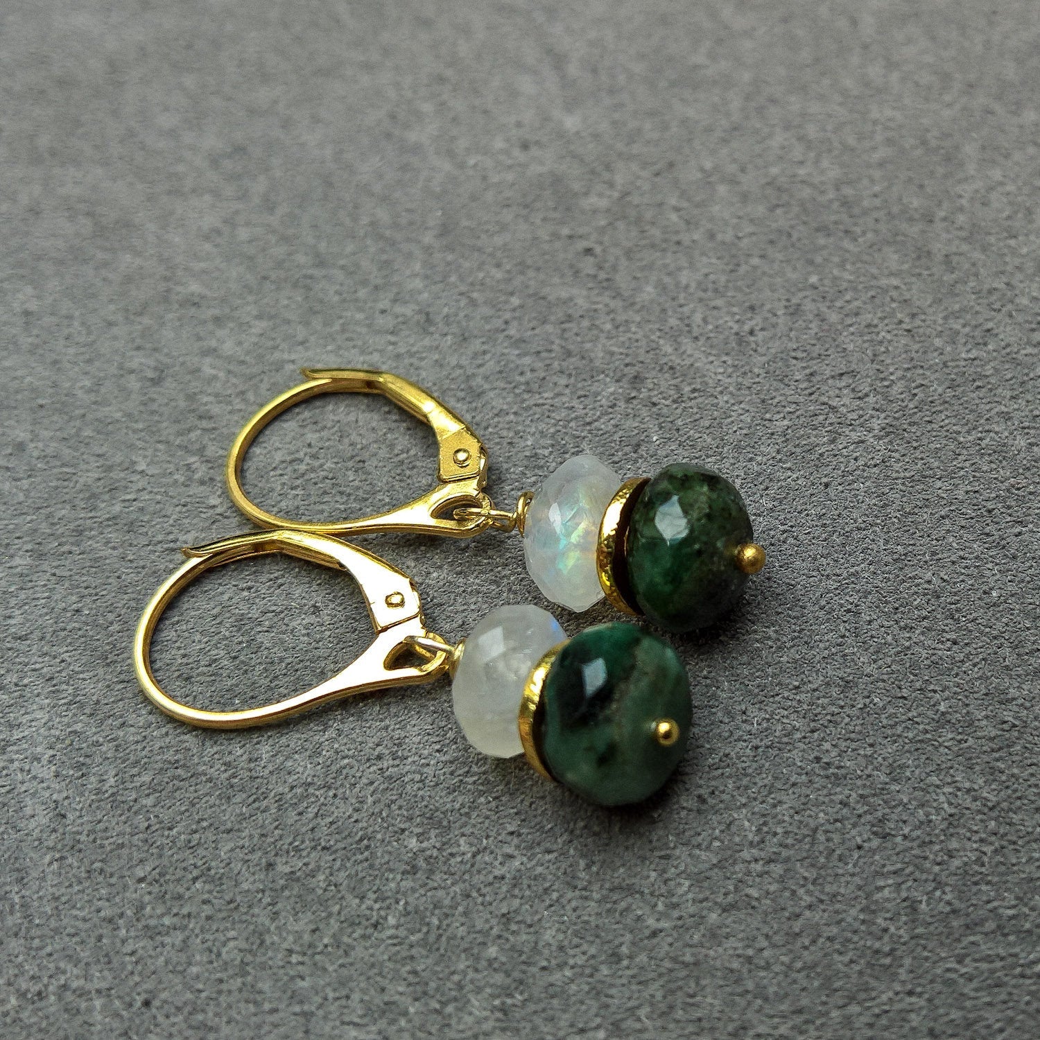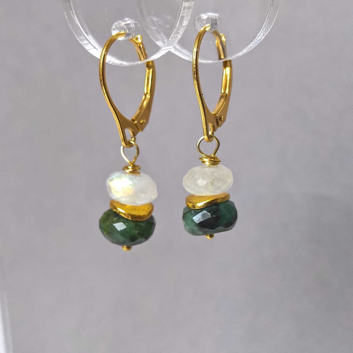 - 1 pair of Raw emerald and rainbow moonstone gold dangle earrings