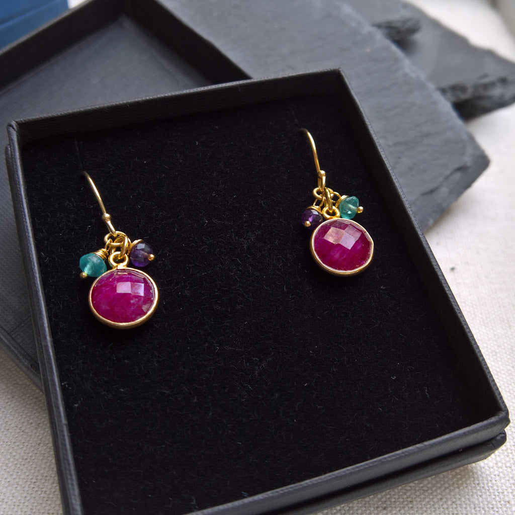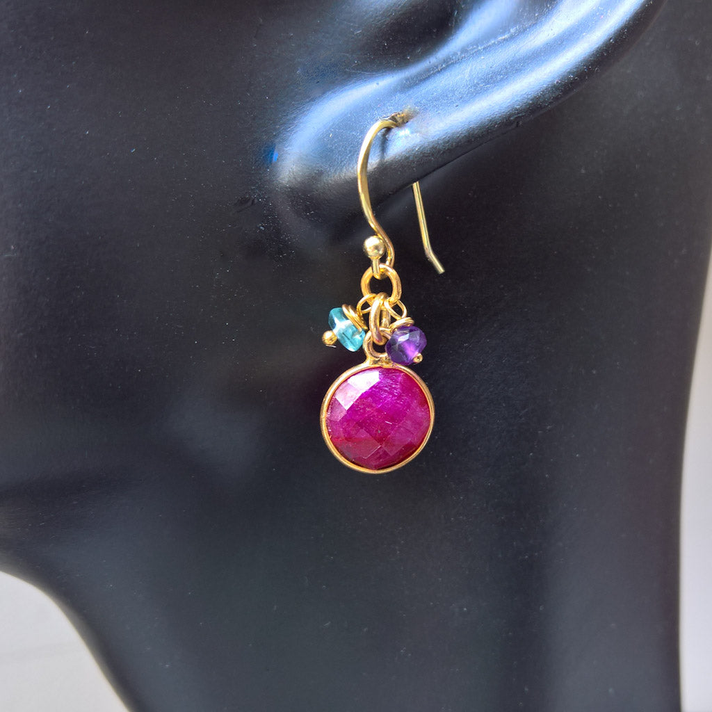 Ruby vermeil silver earrings - Sparkling faceted red ruby drop earrings in 24kt gold vermeil silver accented with blue apatite and amethyst drops. These gorgeous gold gemstone earrings will add a bit of glamour to your outfit day or night!