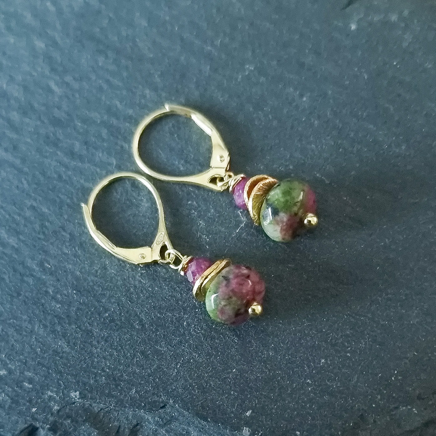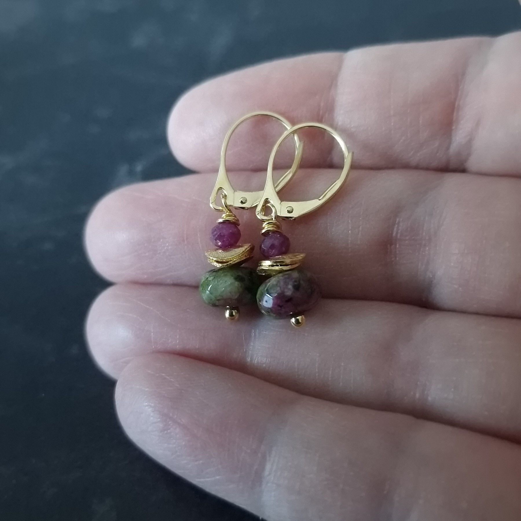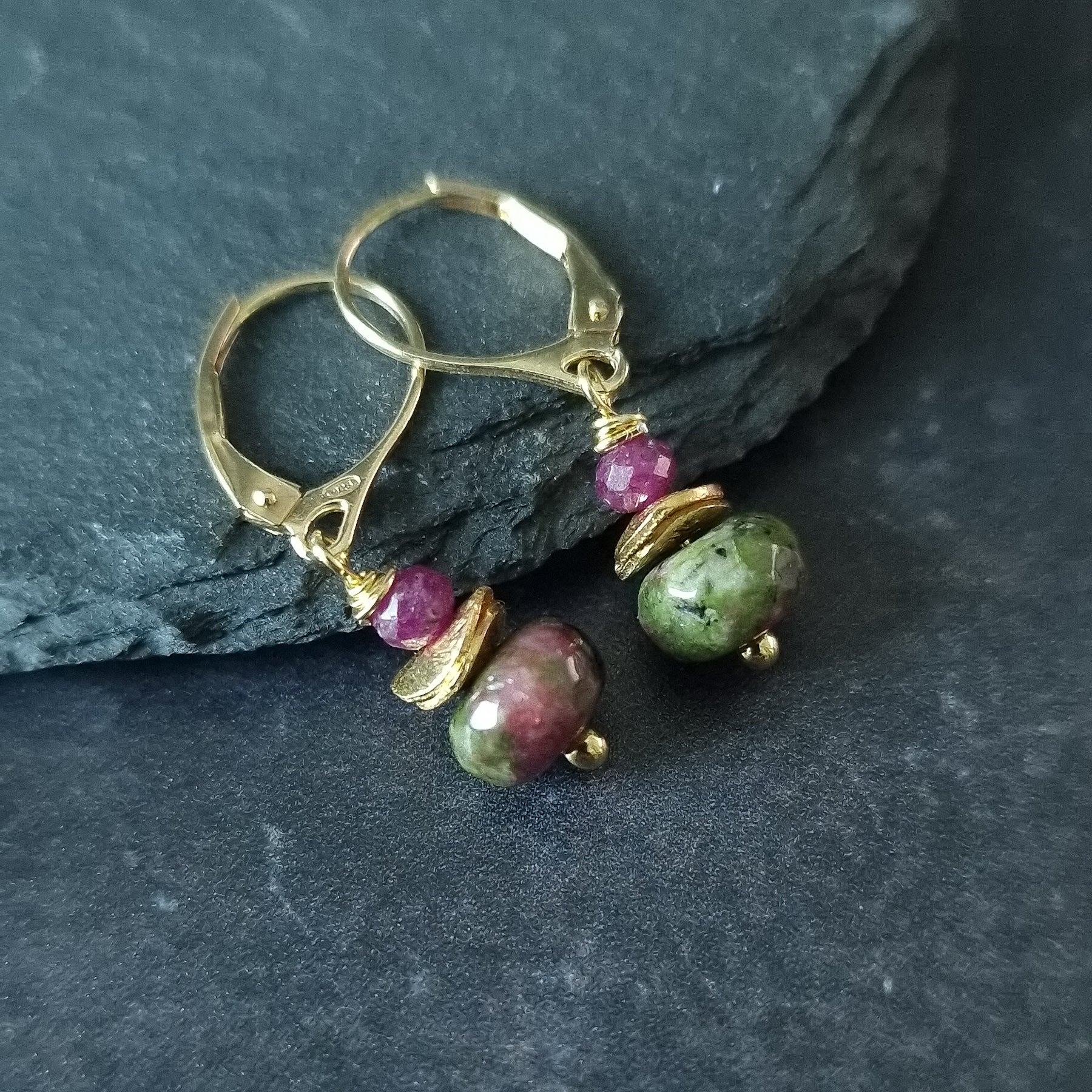 Ruby and ruby zoisite gold vermeil drop earrings - these LIMITED EDITION handcrafted earrings feature natural ruby and ruby zoisite stones with gold vermeil accents. These earrings hang from gold vermeil lever back ear wires and have a drop of 0.75 inches. These gorgeous pink and green earrings are perfect for those who love gemstones and are looking for a unique and elegant piece of jewellery to add to their collection.