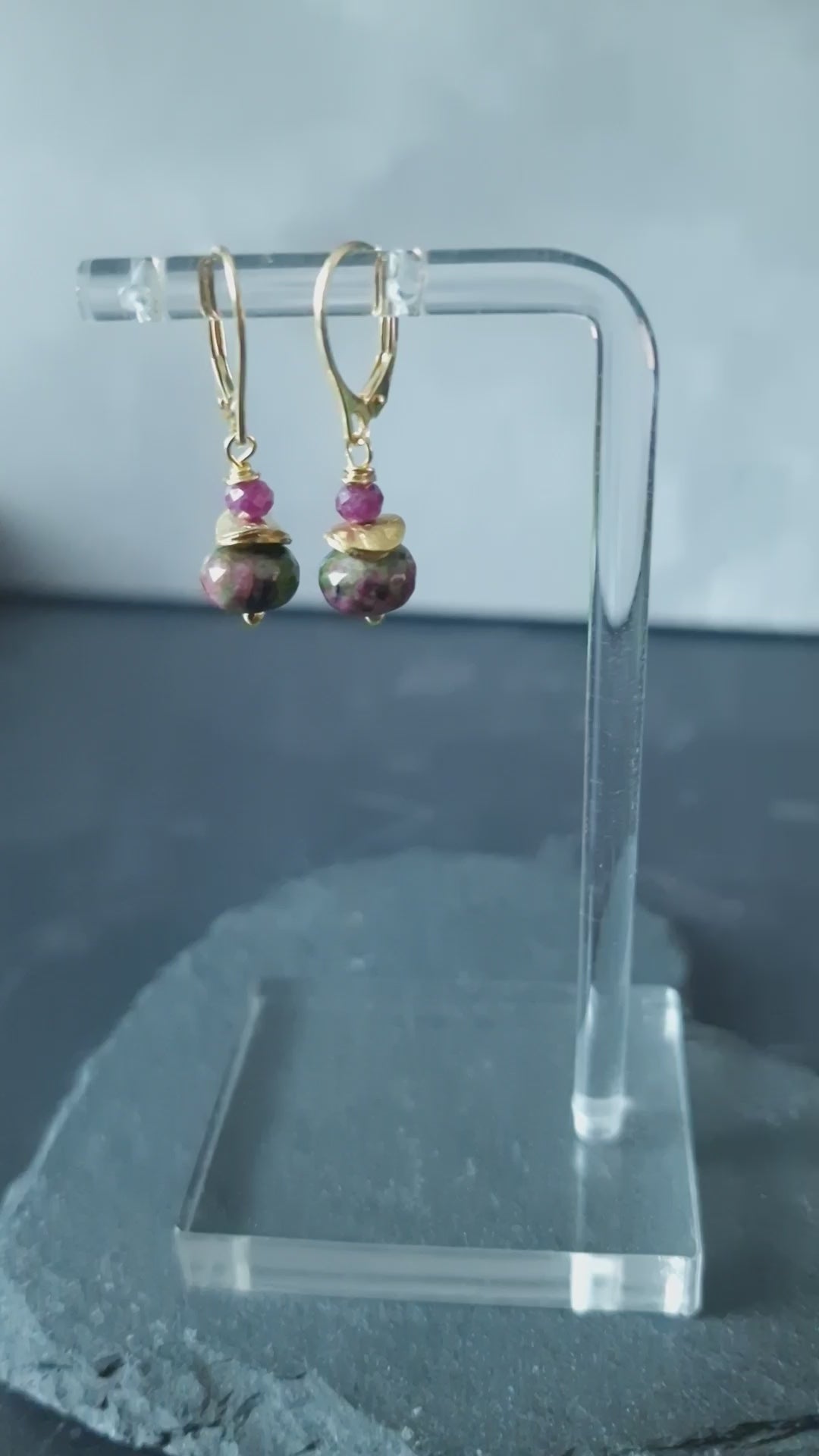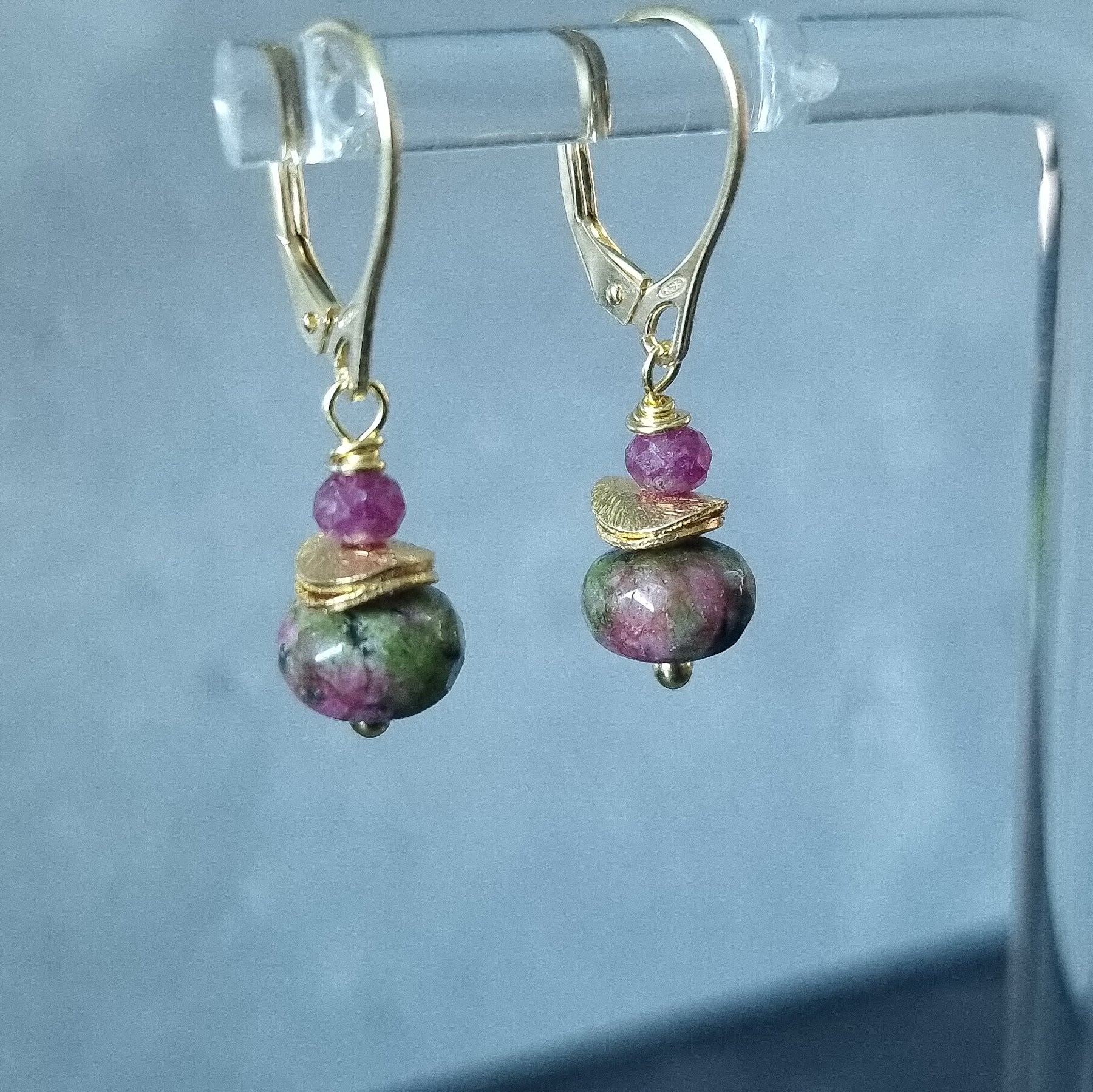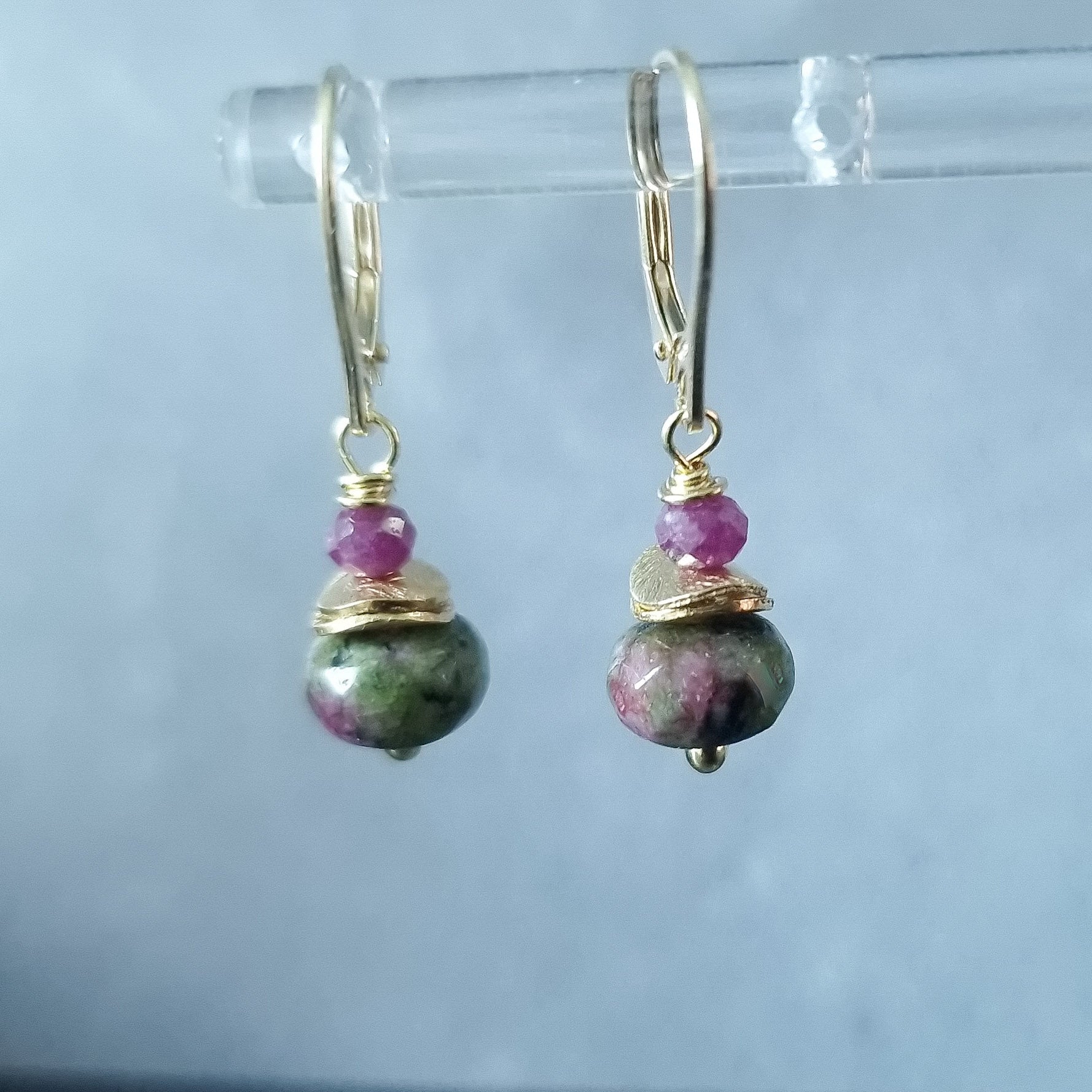 Ruby and ruby zoisite gold vermeil drop earrings - these LIMITED EDITION handcrafted earrings feature natural ruby and ruby zoisite stones with gold vermeil accents. These earrings hang from gold vermeil lever back ear wires and have a drop of 0.75 inches. These gorgeous pink and green earrings are perfect for those who love gemstones and are looking for a unique and elegant piece of jewellery to add to their collection.