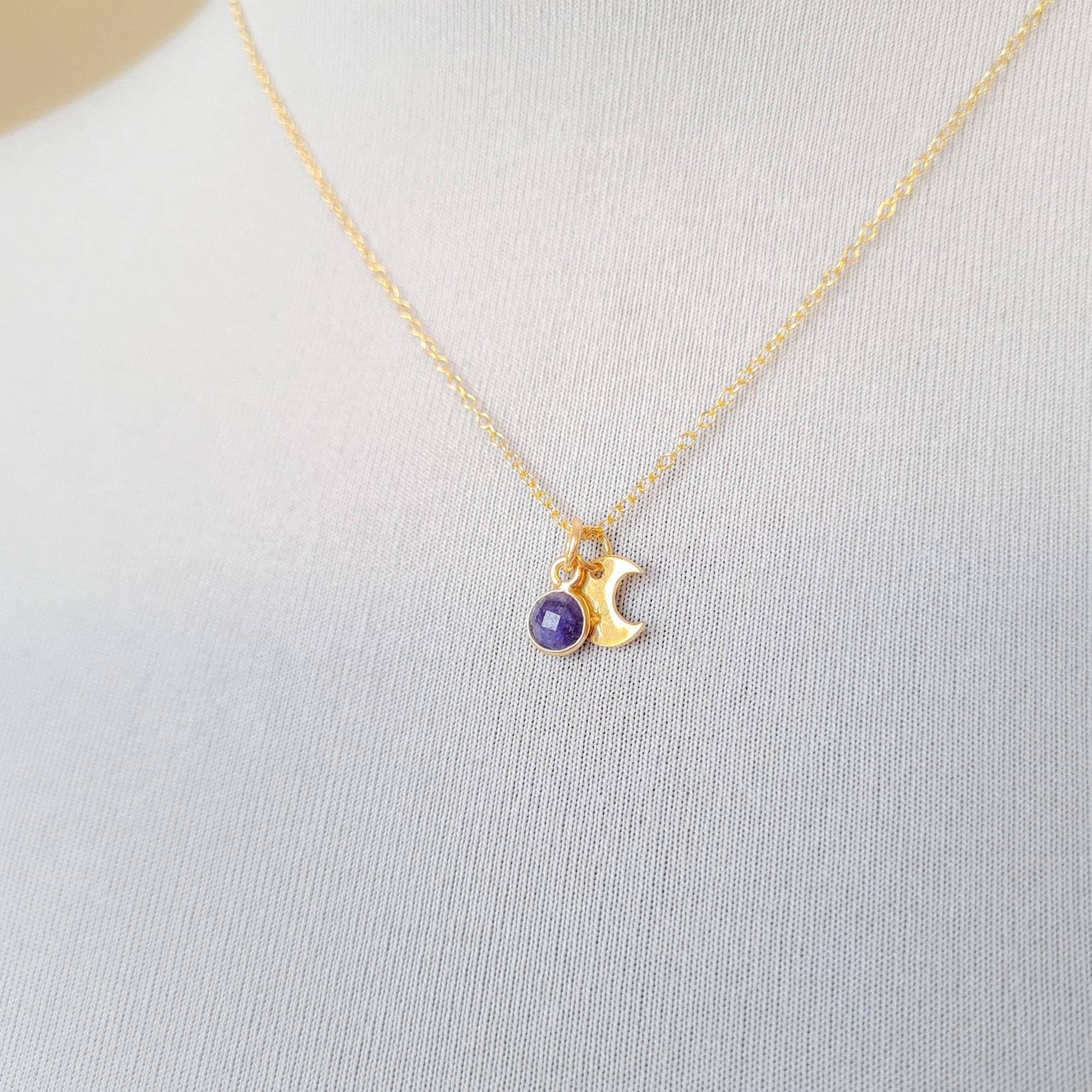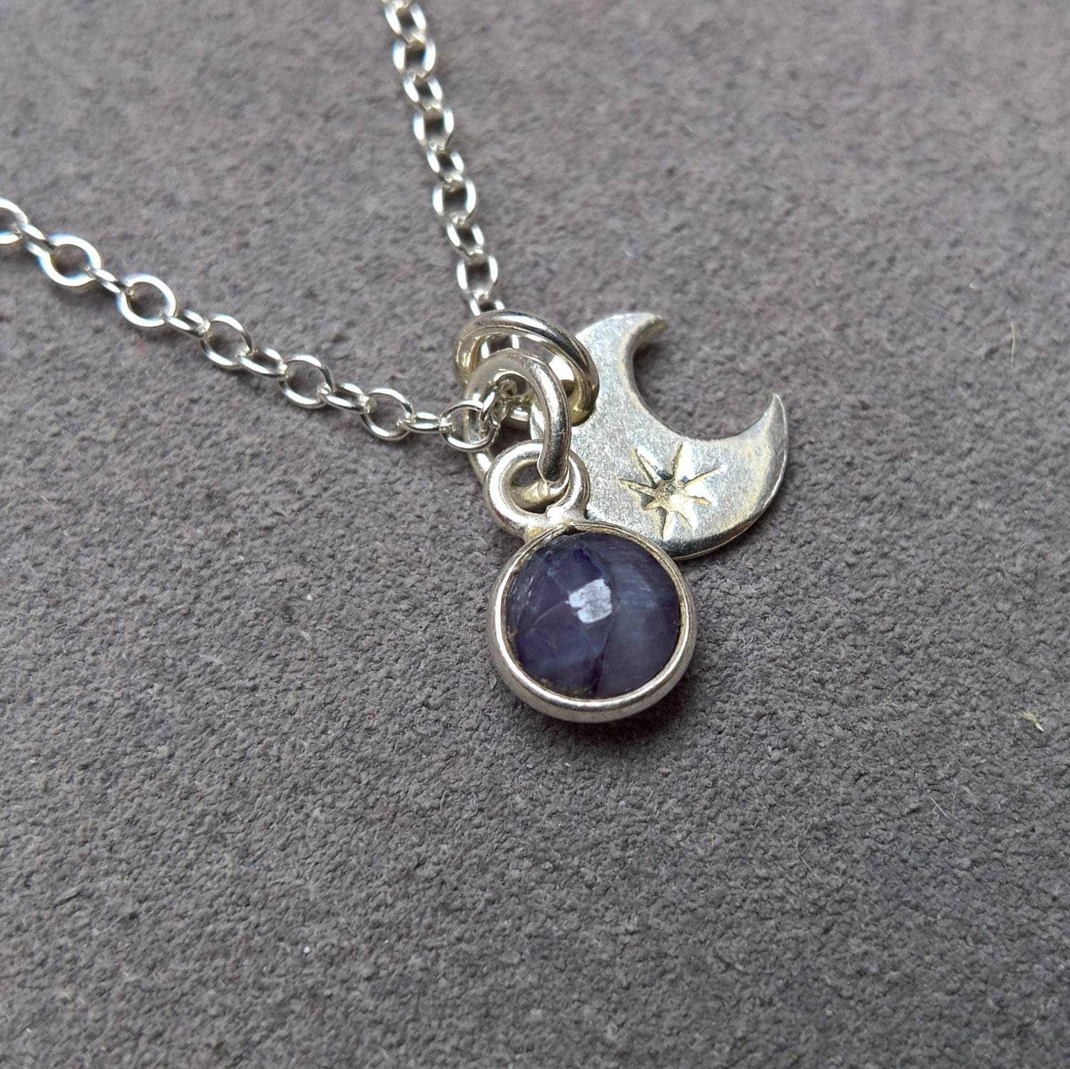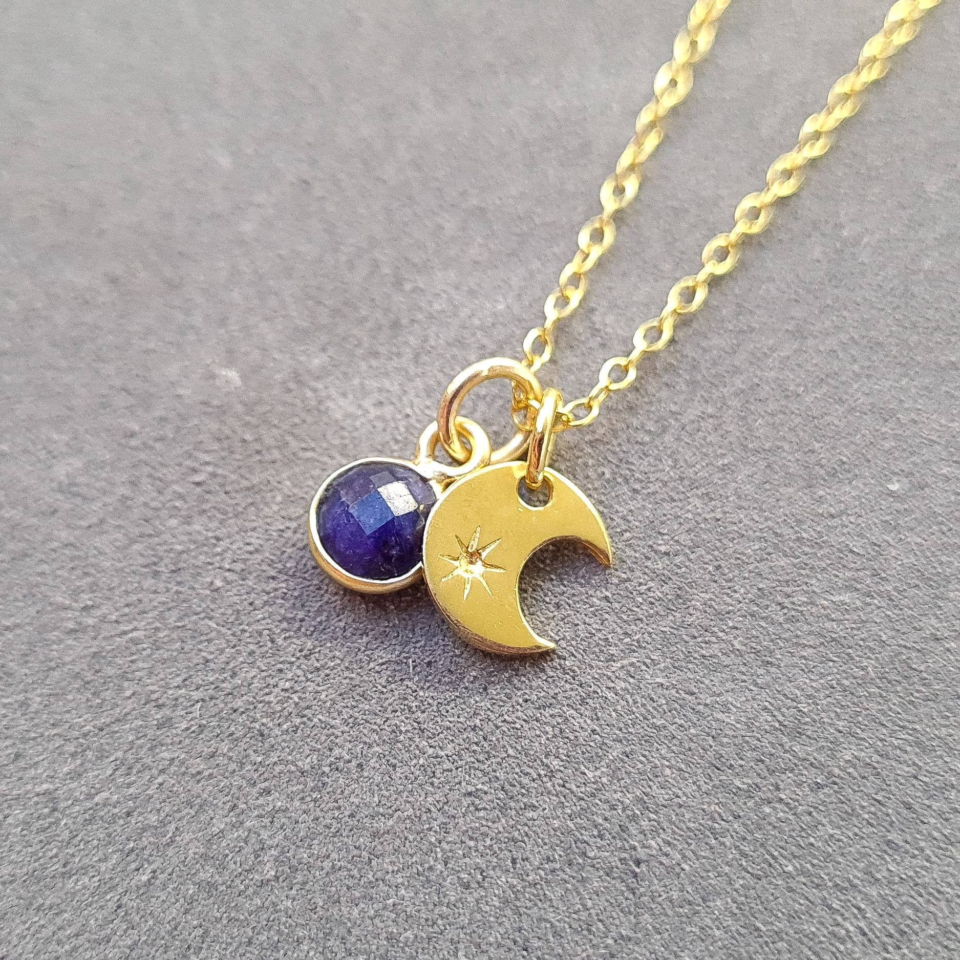 - One blue sapphire pendant and crescent moon necklace in sterling silver or gold vermeil