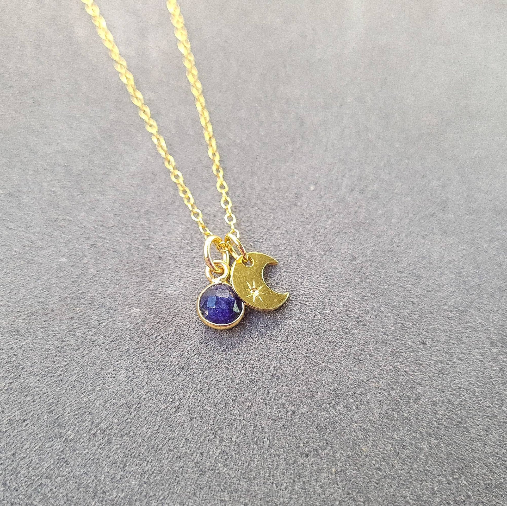 Sapphire and crescent moon charm gold vermeil necklace - For lovers of dainty jewellery. A tiny sapphire pendant hangs with a delicate crescent moon charm on dainty gold vermeil chain.