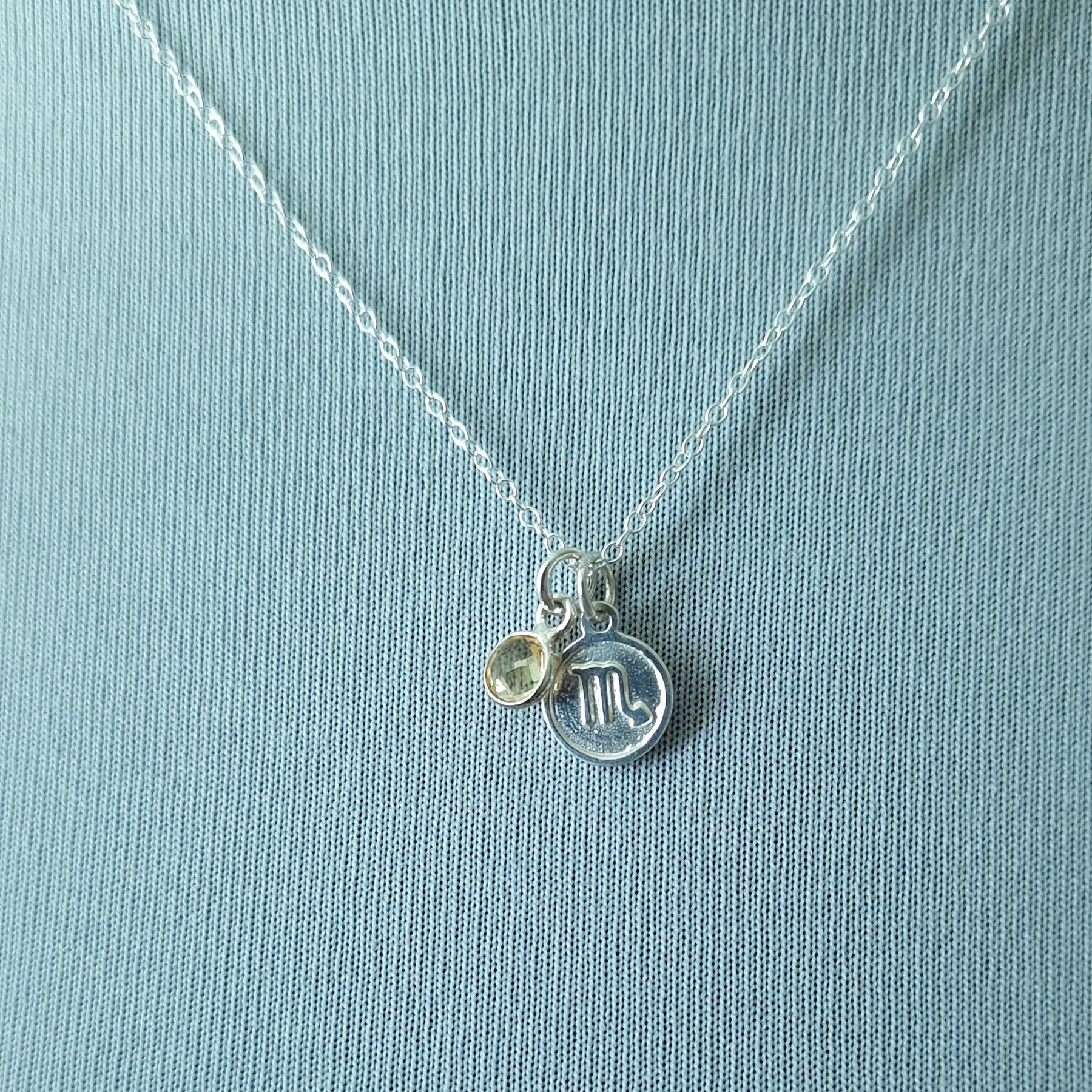 Scorpio Citrine Pendant Necklace Sterling Silver - Perfect for those who love dainty jewelry, this delicate sterling silver citrine pendant features a silver Scorpio charm, both elegantly suspended on a silver chain. This citrine pendant can be worn alone or layered with other necklaces.