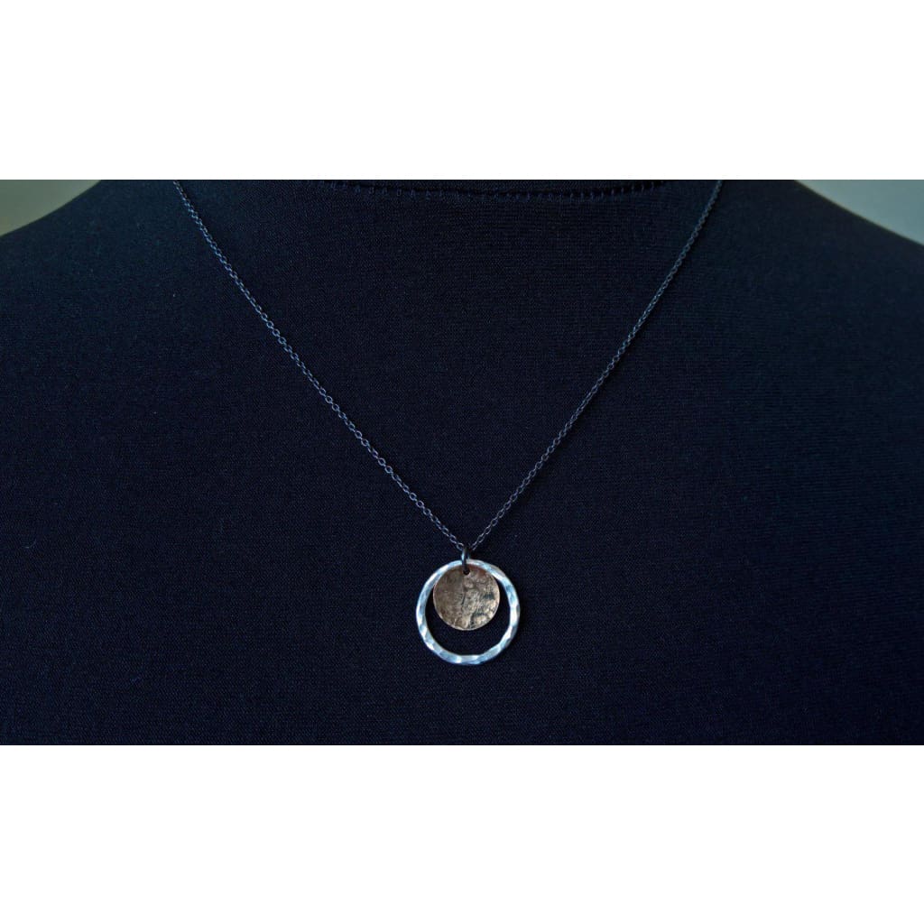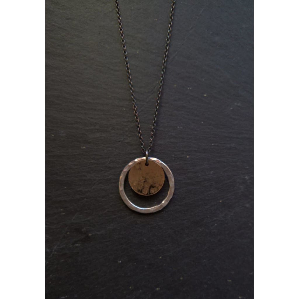 Silver & Gold circle pendant necklace - Fused fine silver & gold filled circles hang together on a oxidised silver chain. Make a bold statement with this simple mixed metal silver necklace. Both circles have been hammered to add a subtle sparkle to the metal contrasting with the matte finish of the oxidised sterling silver chain.