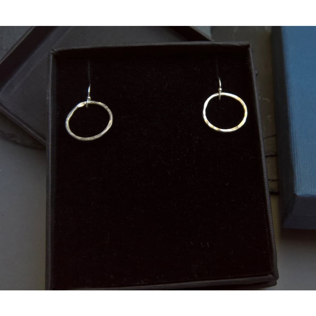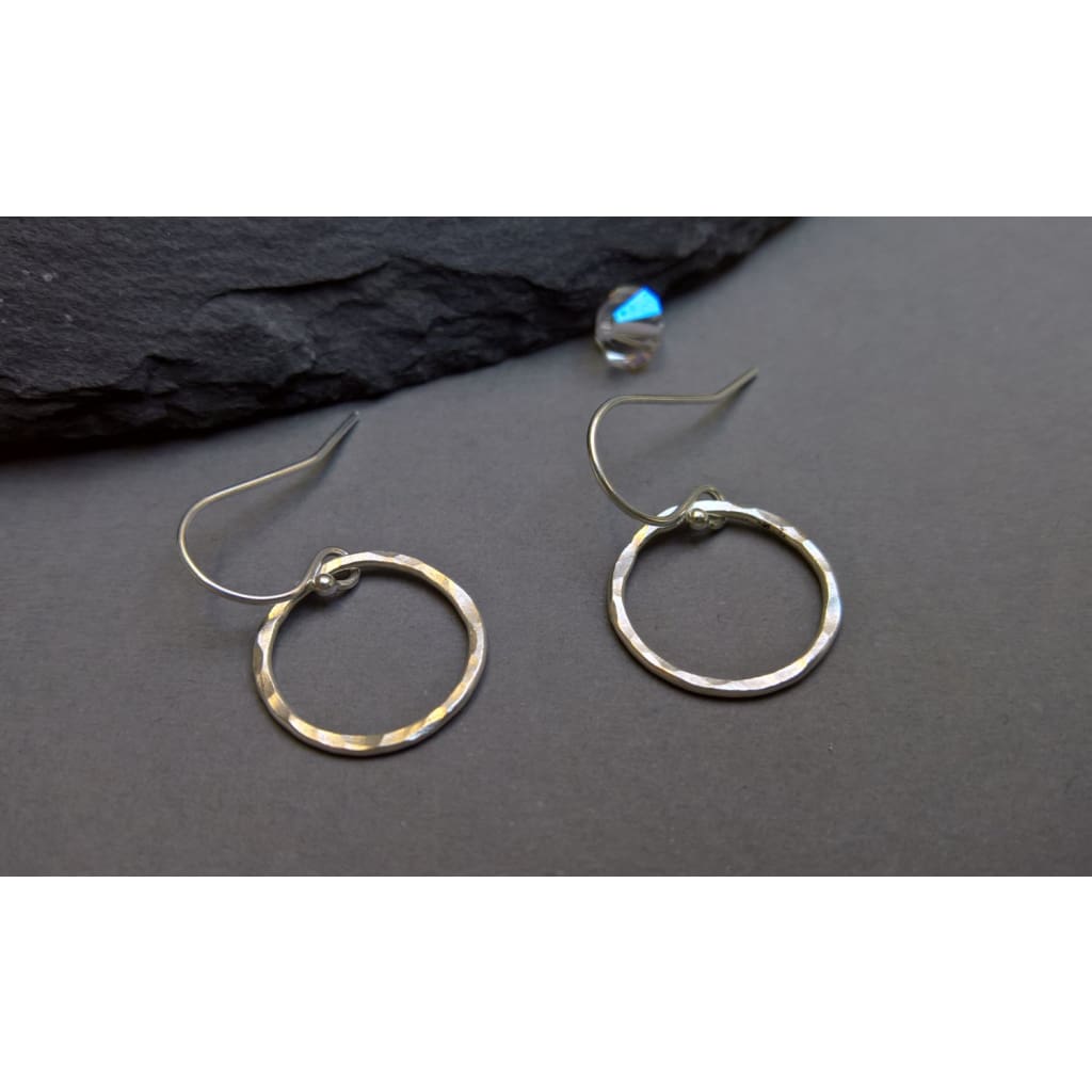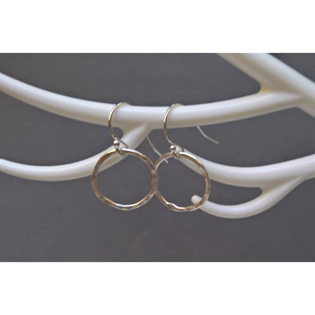 Dainty silver hoop earrings - Tiny silver hoops earrings hang off sterling silver shepherd's hook ear wires. The delicate earrings are light and easy to wear - great for everyday! Made from fused fine silver, the hoops have been hammered to sparkle as they swing in your ears.