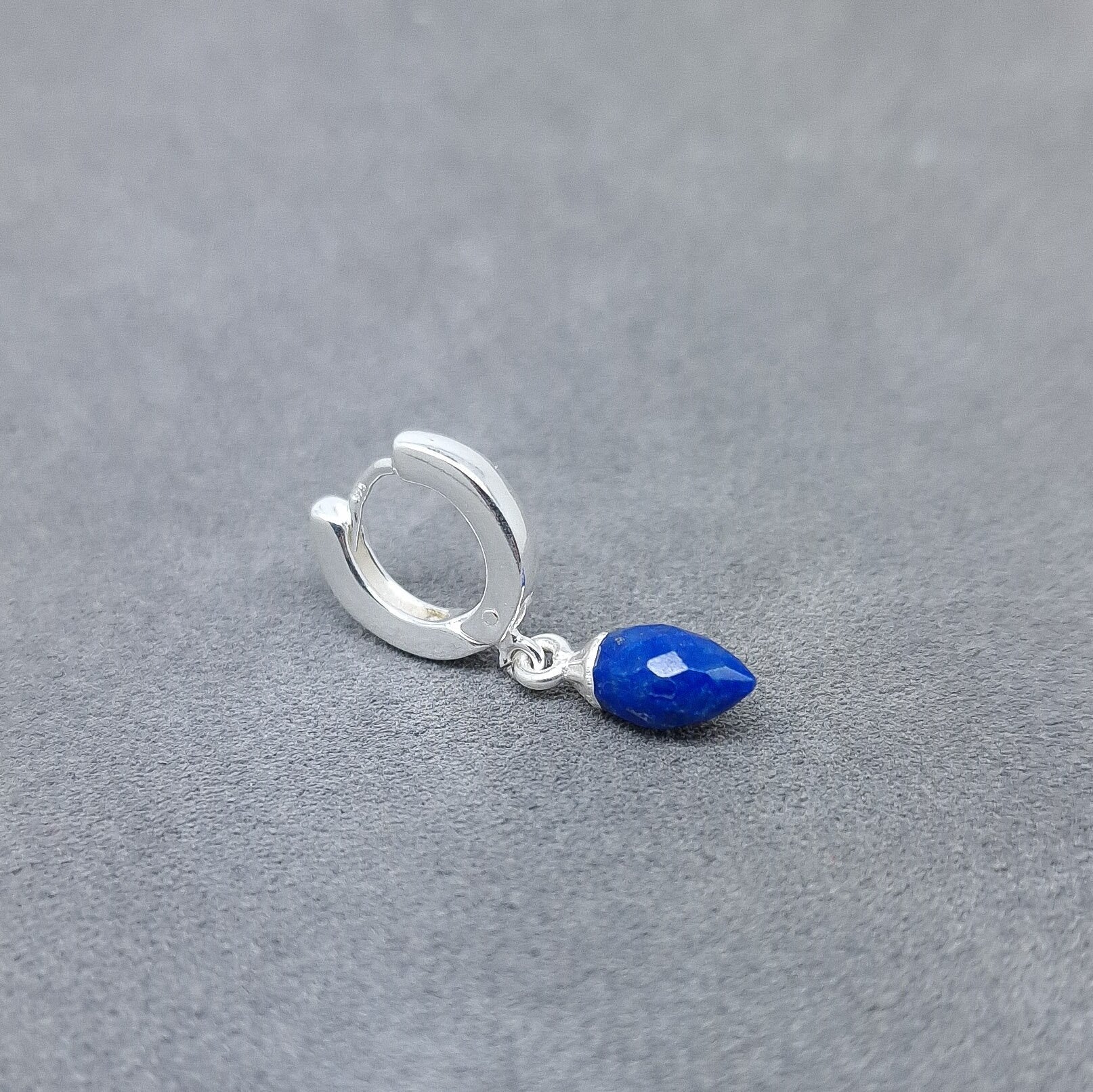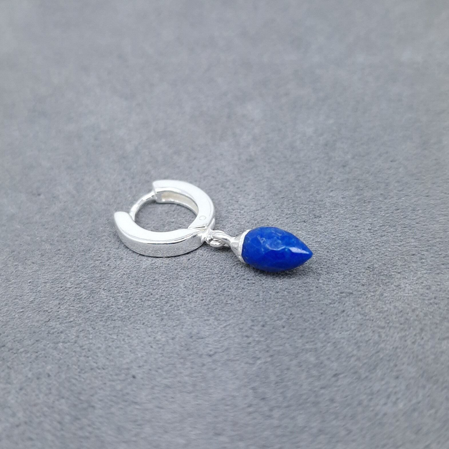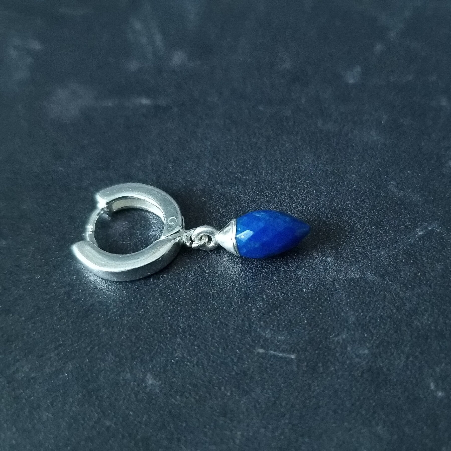 Lapis Lazuli Single Huggie Hoop Earrings Sterling Silver features a stunning rich blue faceted marquise lapis lazuli stone dangling off a single sterling silver chunky huggie earring. Wear it on its own or mix and match it with our other single huggies. Perfect for Women or Men.