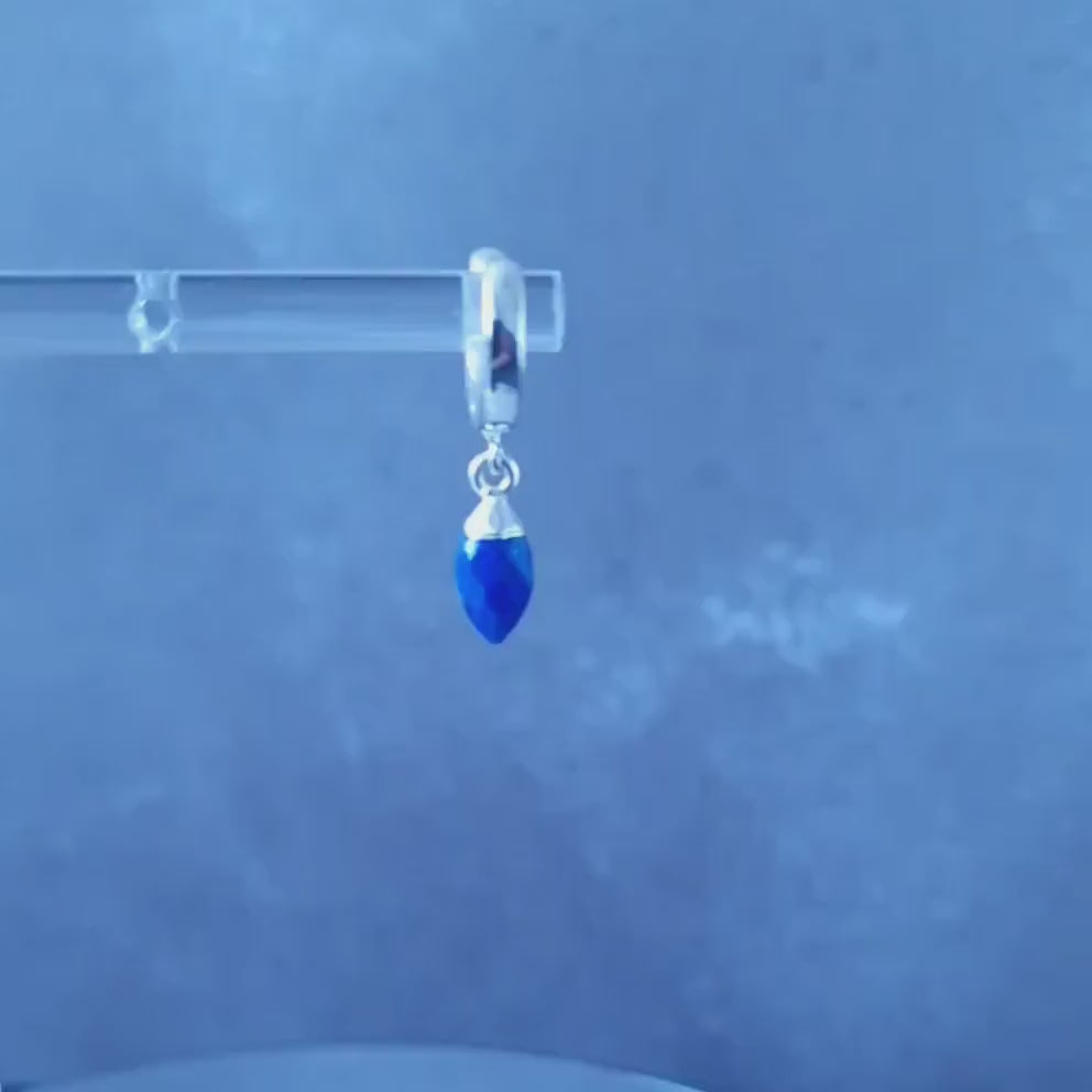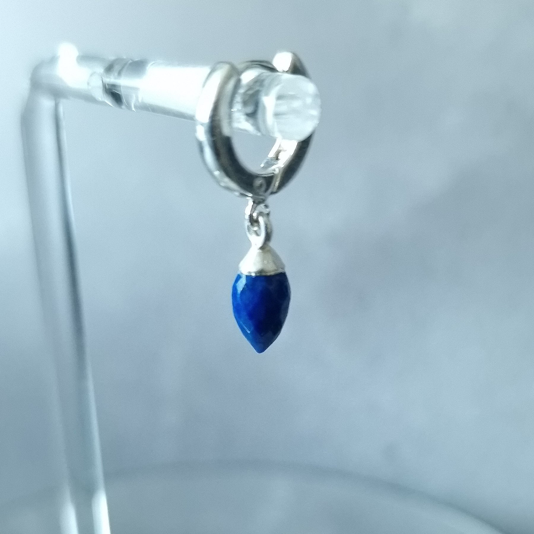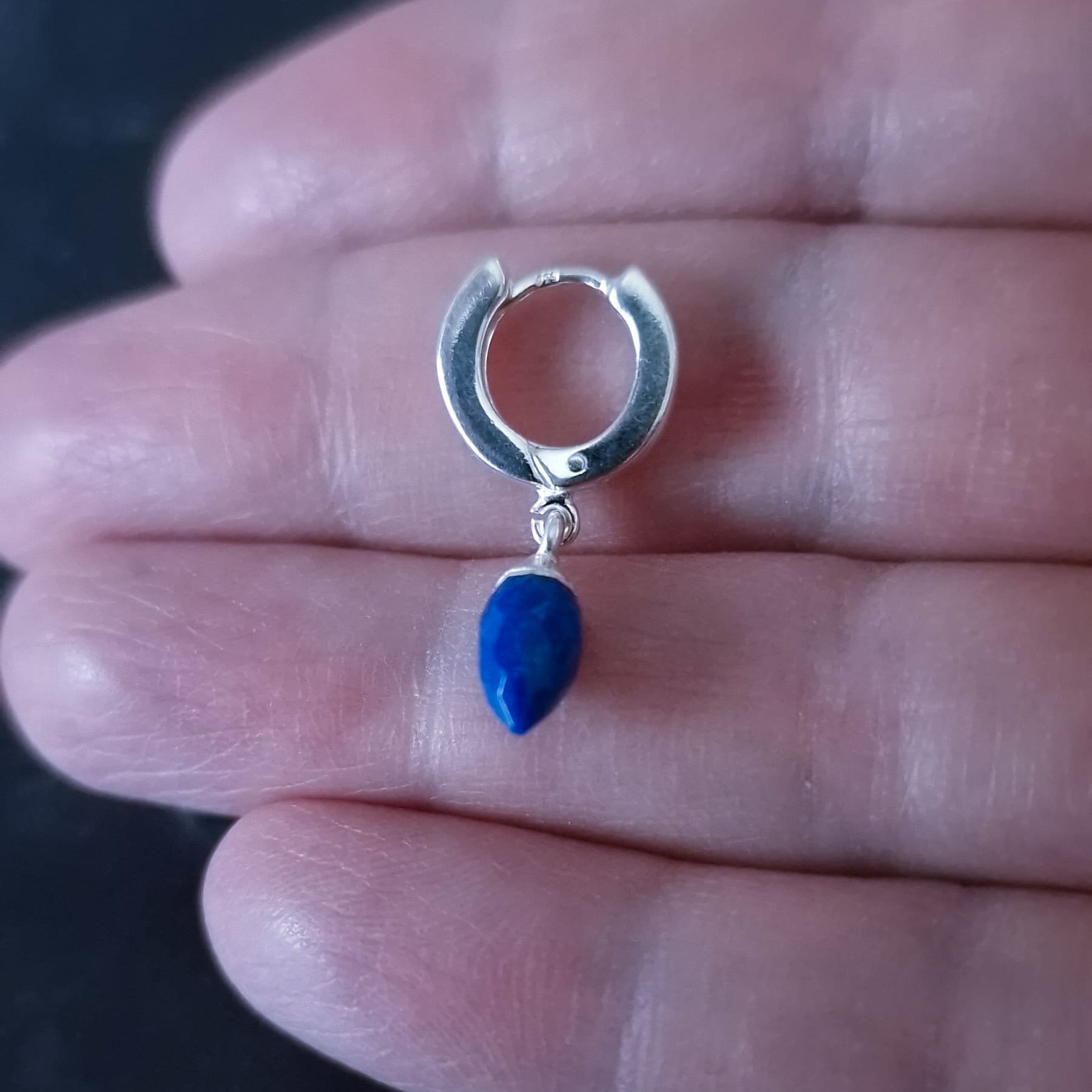 Lapis Lazuli Single Huggie Hoop Earrings Sterling Silver features a stunning rich blue faceted marquise lapis lazuli stone dangling off a single sterling silver chunky huggie earring. Wear it on its own or mix and match it with our other single huggies. Perfect for Women or Men.