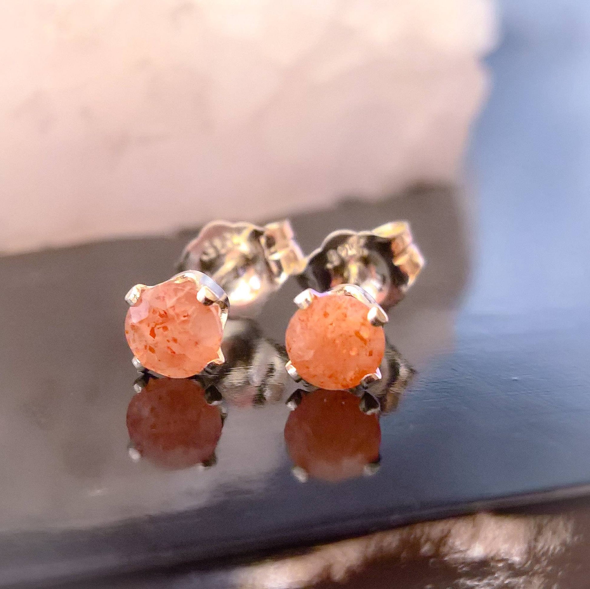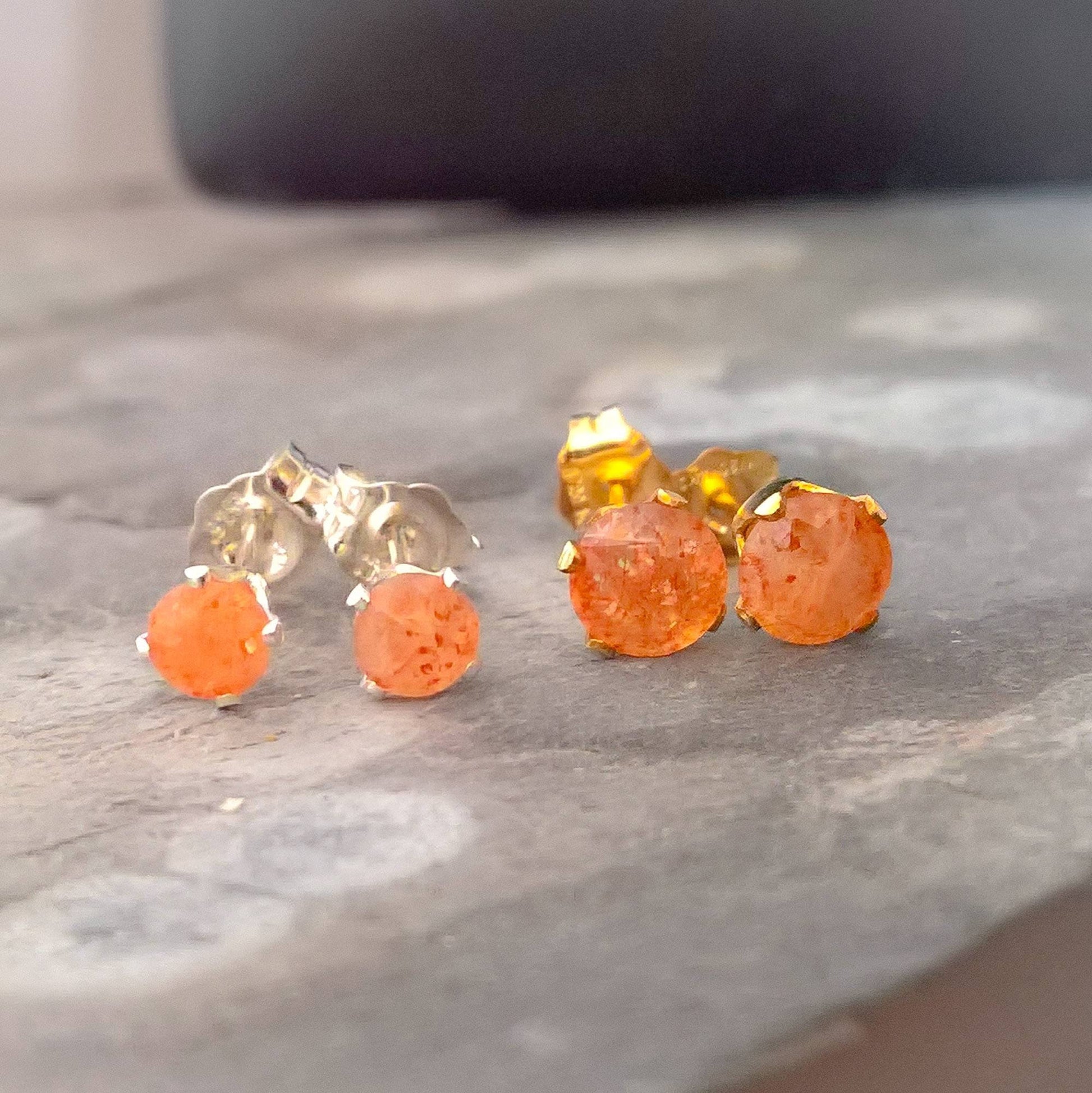 Sunstone sterling silver or gold filled stud earrings - dainty orange sunstone studs will bring a bit of drama to any autumn outfit! Choose from 3 sizes: 4mm, 5mm or 6mm and two finishes: Sterling Silver or Gold Filled.