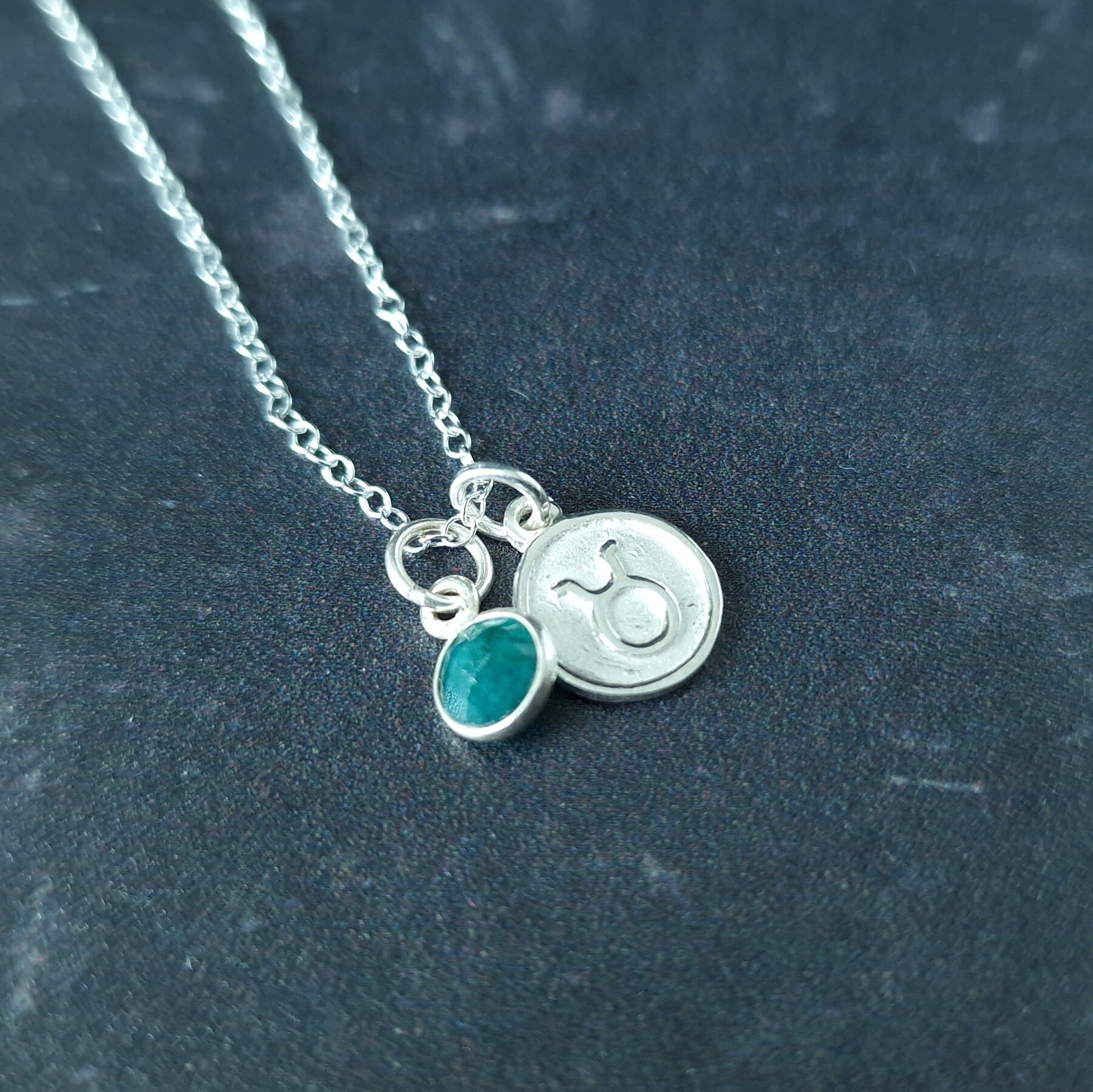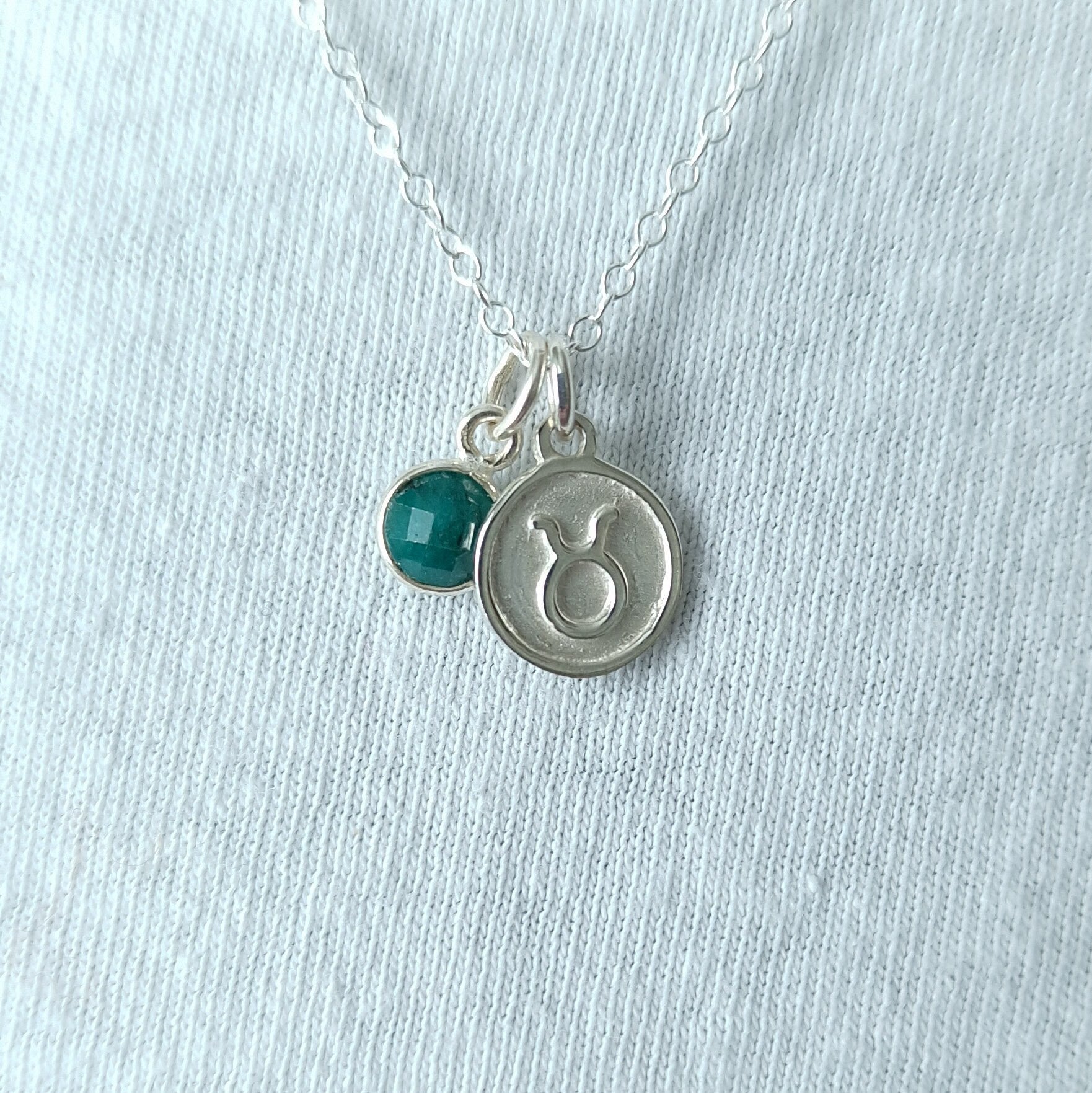 Taurus and Emerald Pendant Necklace Sterling Silver - Ideal for fans of dainty jewellery, this delicate sterling silver emerald pendant comes with a silver Taurus charm, both hanging on a silver chain. This emerald pendant can be worn alone or layered with other necklaces.