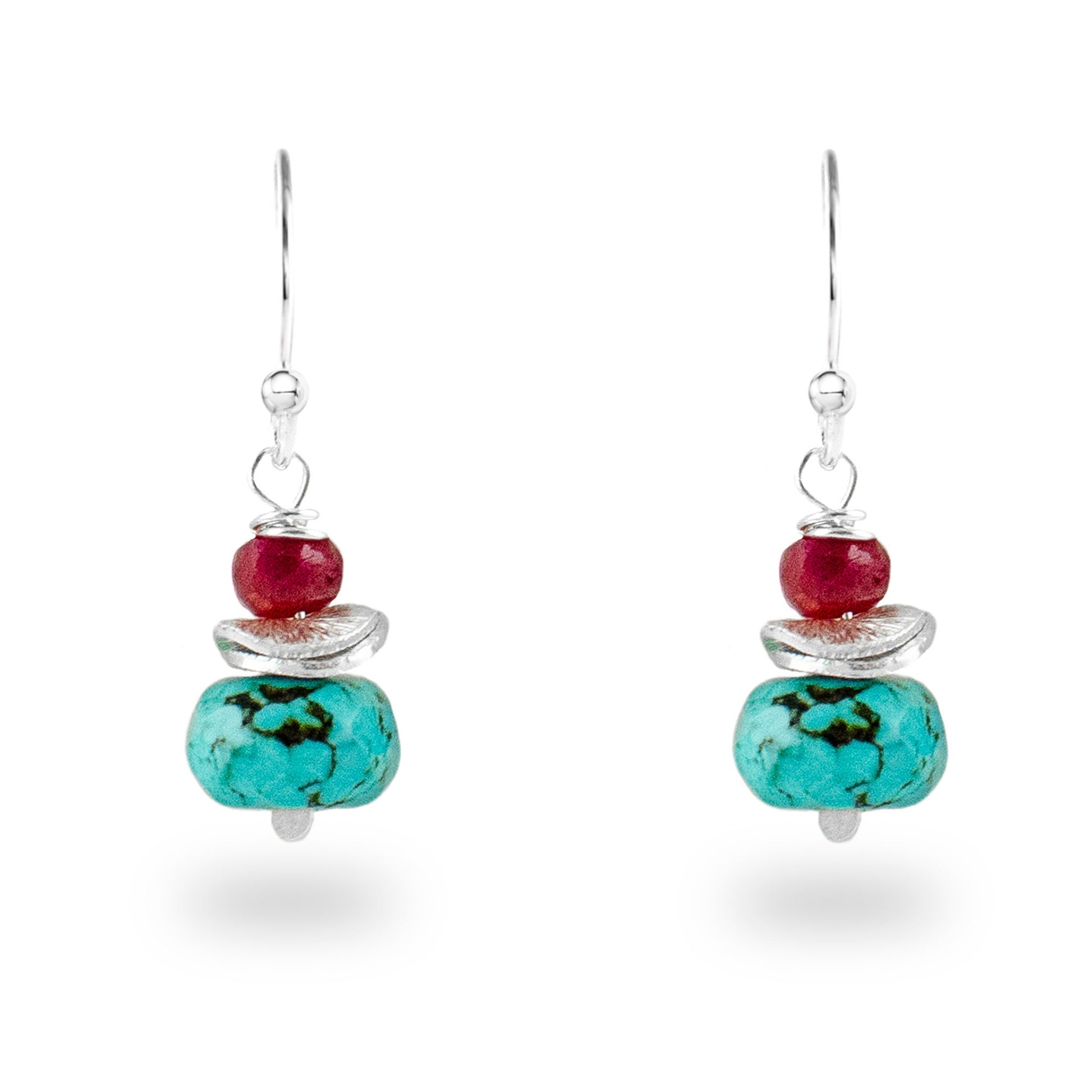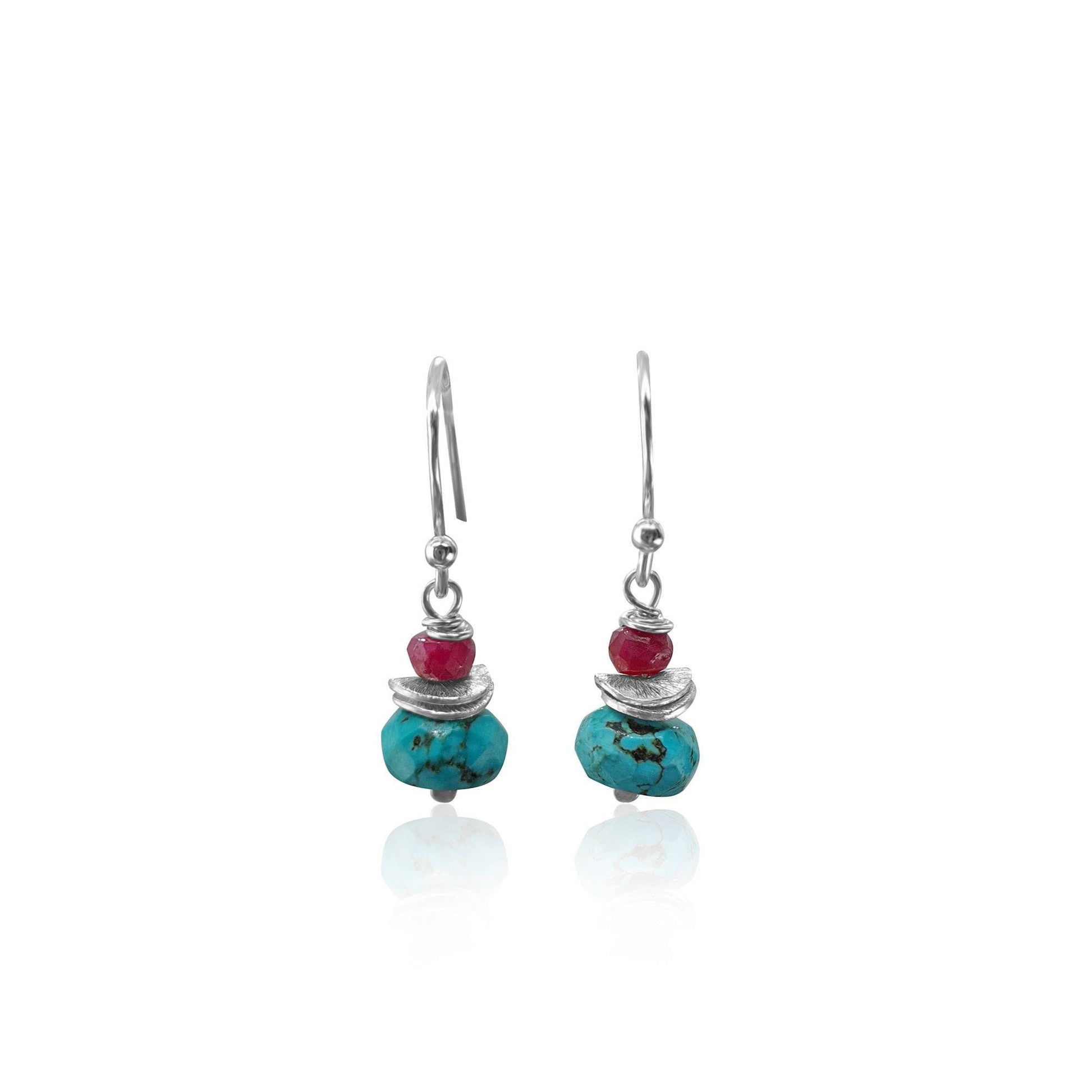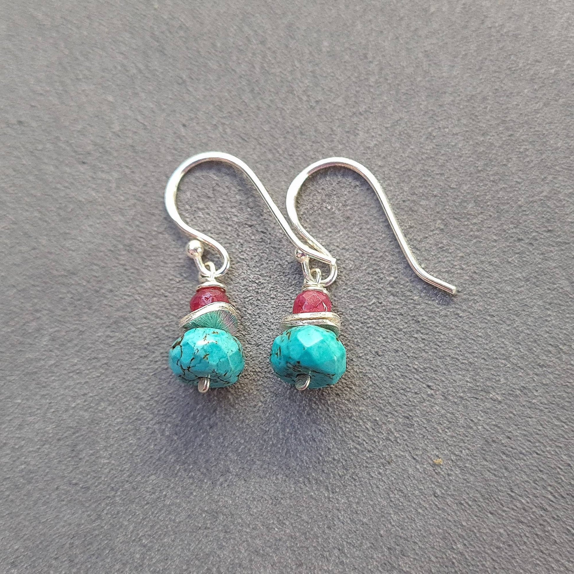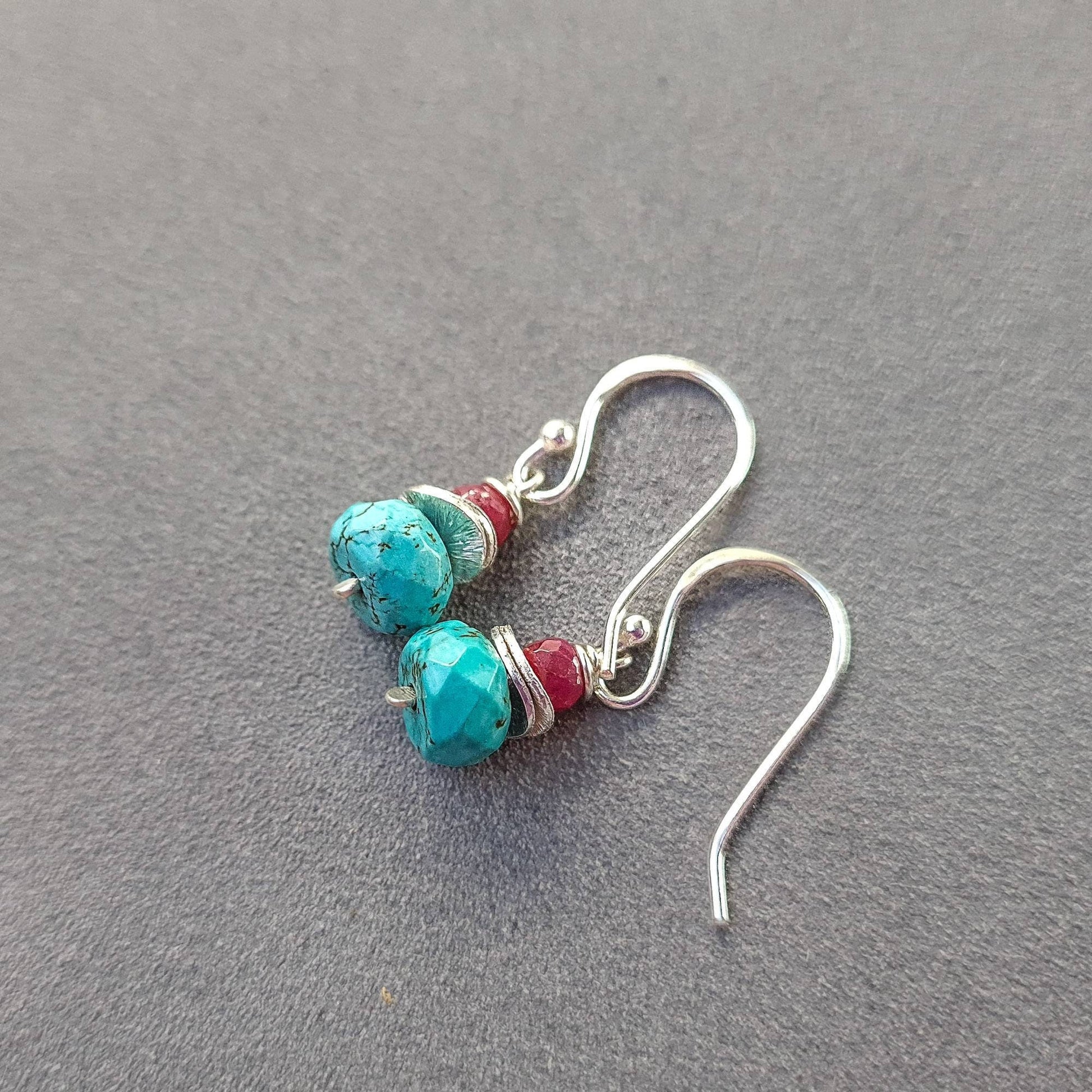 Turquoise and ruby sterling silver drop earrings - Dainty drops featuring turquoise and ruby stones with sterling silver accents and sterling silver shepherd's hook ear wires.